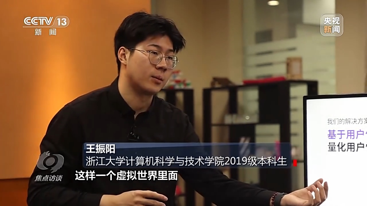 浙江大学计算机科学与技术学院2019级本科生 王振阳:我们用圆滚滚的形象去承载用户自己一些内在特质,只要用户授权给我们信息,我们可以收集用户不同方面的标签,包括睡眠、运动、健康、App使用情况,把用户形象映射到这样一个虚拟世界里面。
