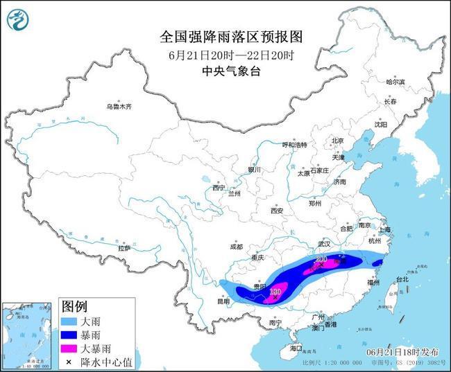 预计,6月21日20时至22日20时,贵州东部和南部、云南东部、广西北部、湖南中部、江西中北部、浙江南部、福建北部等地有大到暴雨,其中,贵州东南部、广西西北部、湖南中部、江西中部等地部分地区有大暴雨(100~200毫米)。上述部分地区有短时强降水(最大小时降雨量40~60毫米,局地可超过80毫米),局地伴有雷暴大风等强对流天气。