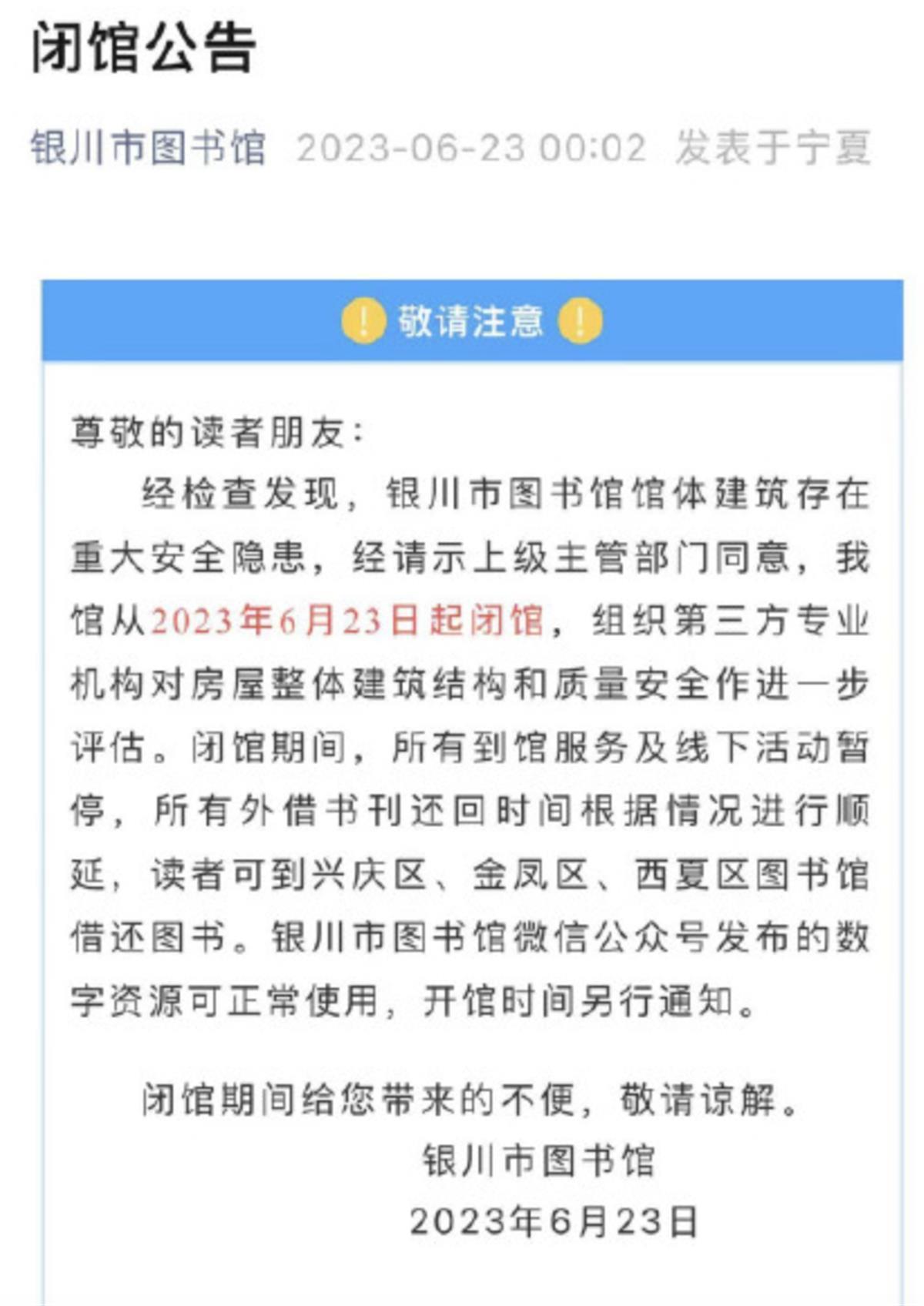 据银川发布报道,6月23日,银川市图书馆发布消息:经检查发现,银川市图书馆馆体建筑存在重大安全隐患,经请示上级主管部门同意,银川市图书馆从6月23日起闭馆,组织第三方专业机构对房屋整体建筑结构和质量安全作进一步评估。