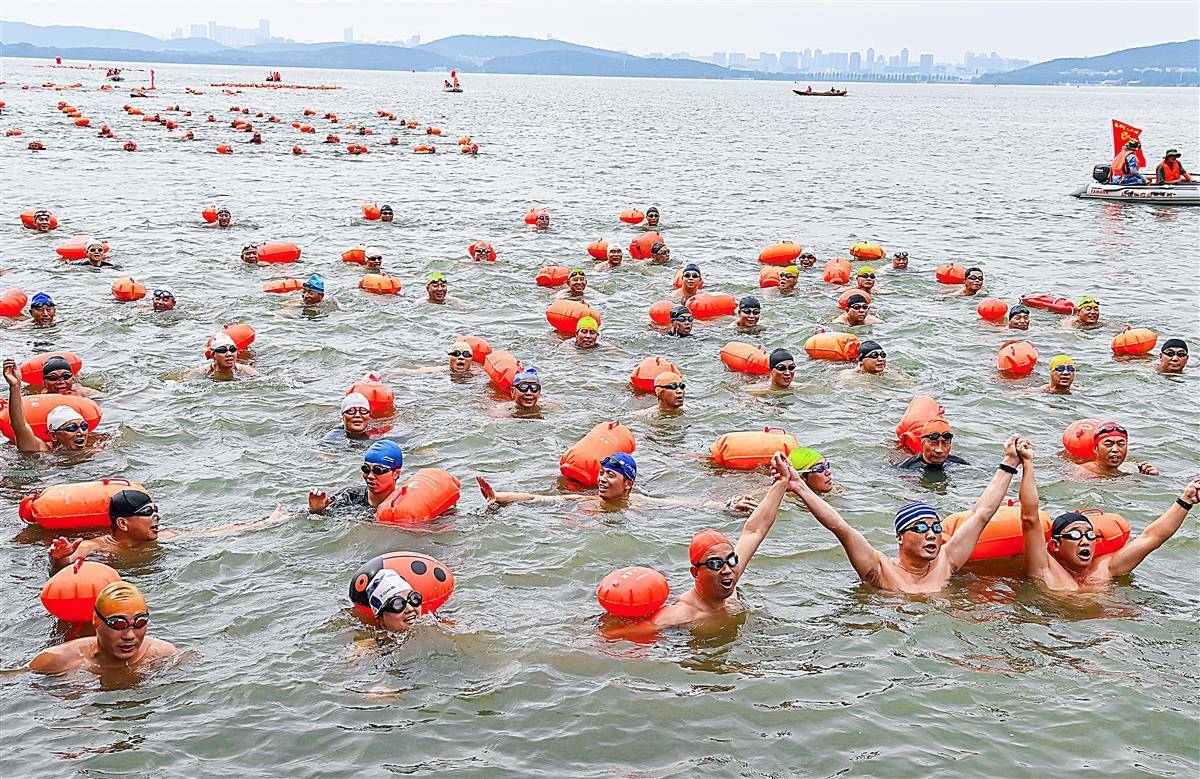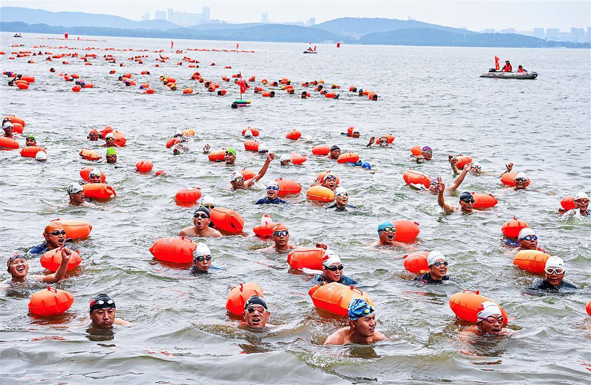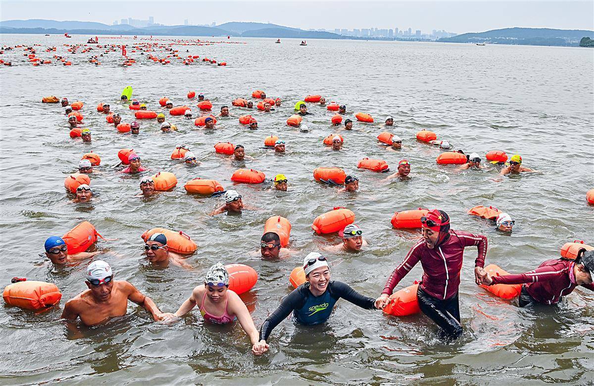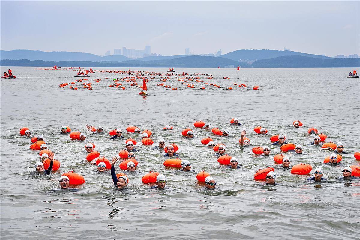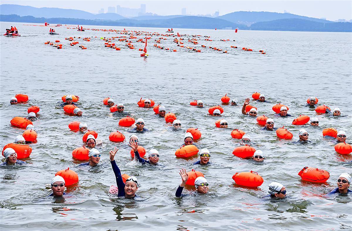 6月23日上午,参加2023年第48届7.16武汉渡江节的21支渡江方队在东湖听涛景区水域,进行了一场壮观的测试赛,大约1400名选手参加测试,接受正式横渡长江前的检验。从早上7点钟开始,东湖长天楼码头就已经开始热闹起来。从武汉三镇赶来的各横渡方队的游泳爱好者陆续集结。按测试要求,各横渡方队必须保持方队队形完整,游完测试距离,对不能按要求完成测试或明显脱离本方队的选手将取消其参加横渡长江活动的资格。(湖北日报全媒记者朱熙勇摄)