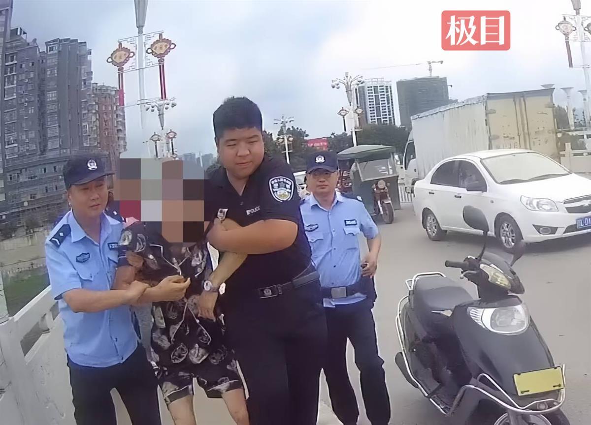 轻生男子已经越过栏杆,随时可能跳下十几米高的桥,千钧一发之际,民警果断出手,一个箭步冲上去,任凭男子身体使劲下坠抗拒救援,民警仍死死抓住其胳膊,将其拽回桥上。