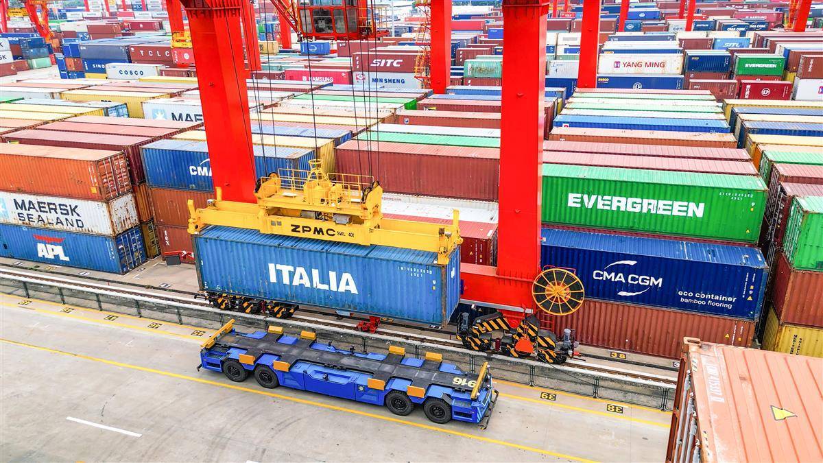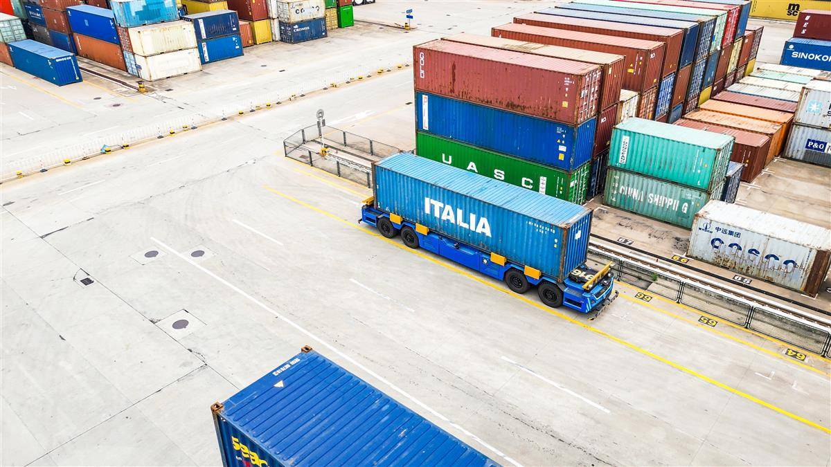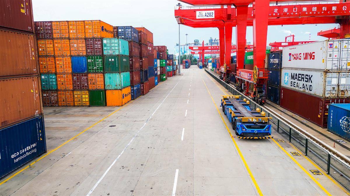 6月16日,武汉阳逻港码头,一辆东风悦享无人驾驶集装箱搬运车正在进行作业。