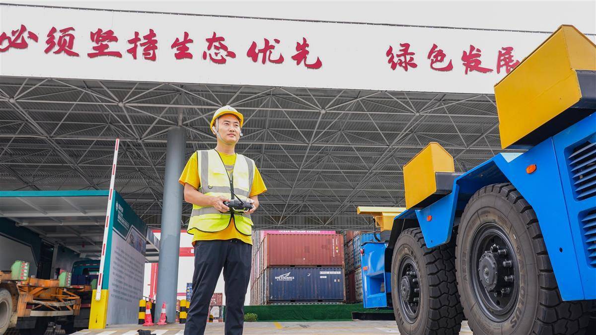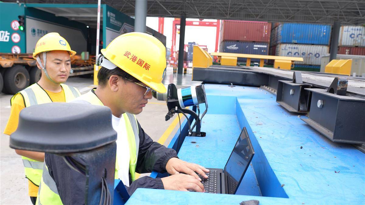 6月16日,武汉阳逻港码头,技术人员正在东风悦享无人驾驶集装箱搬运车旁进行实时监看。
