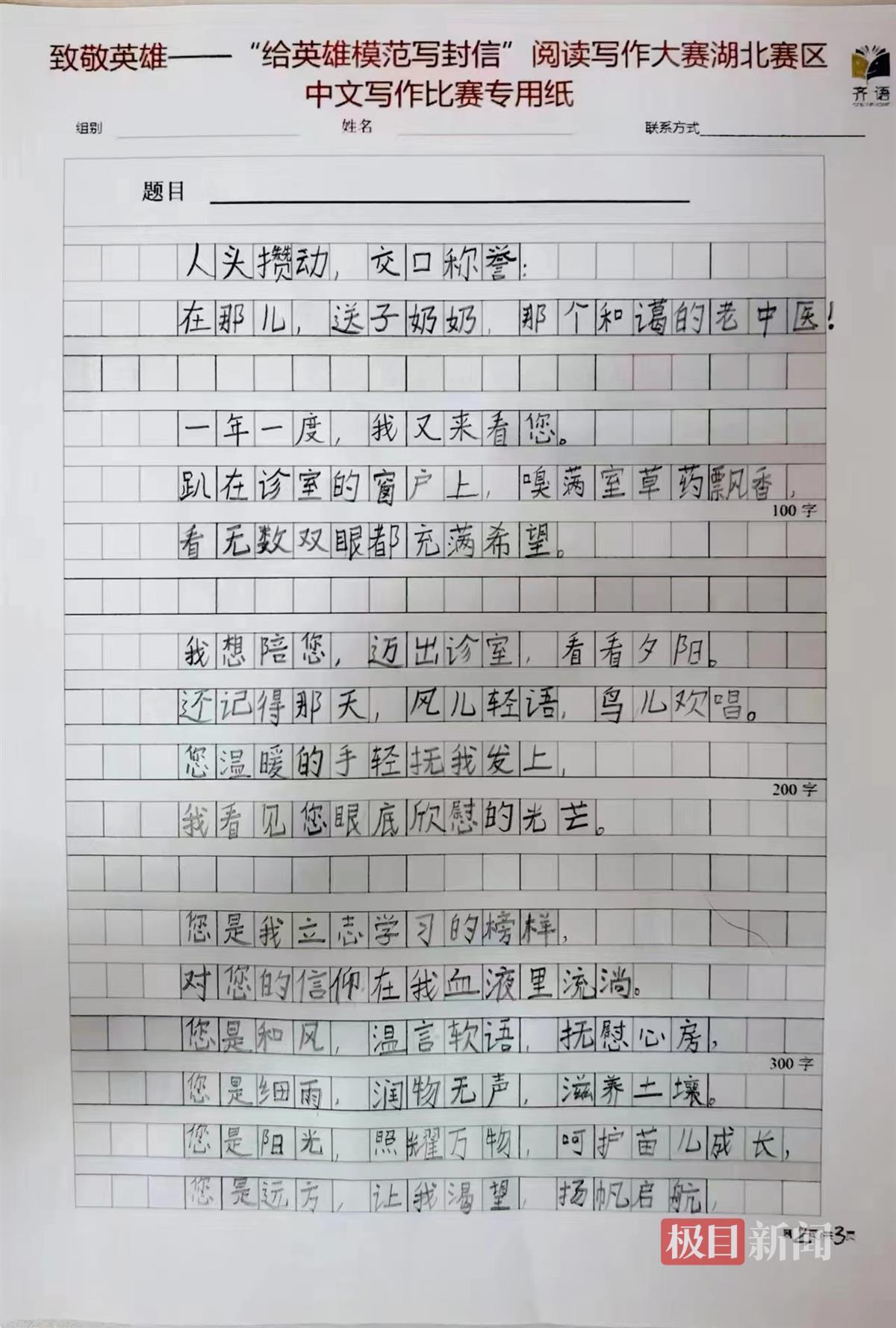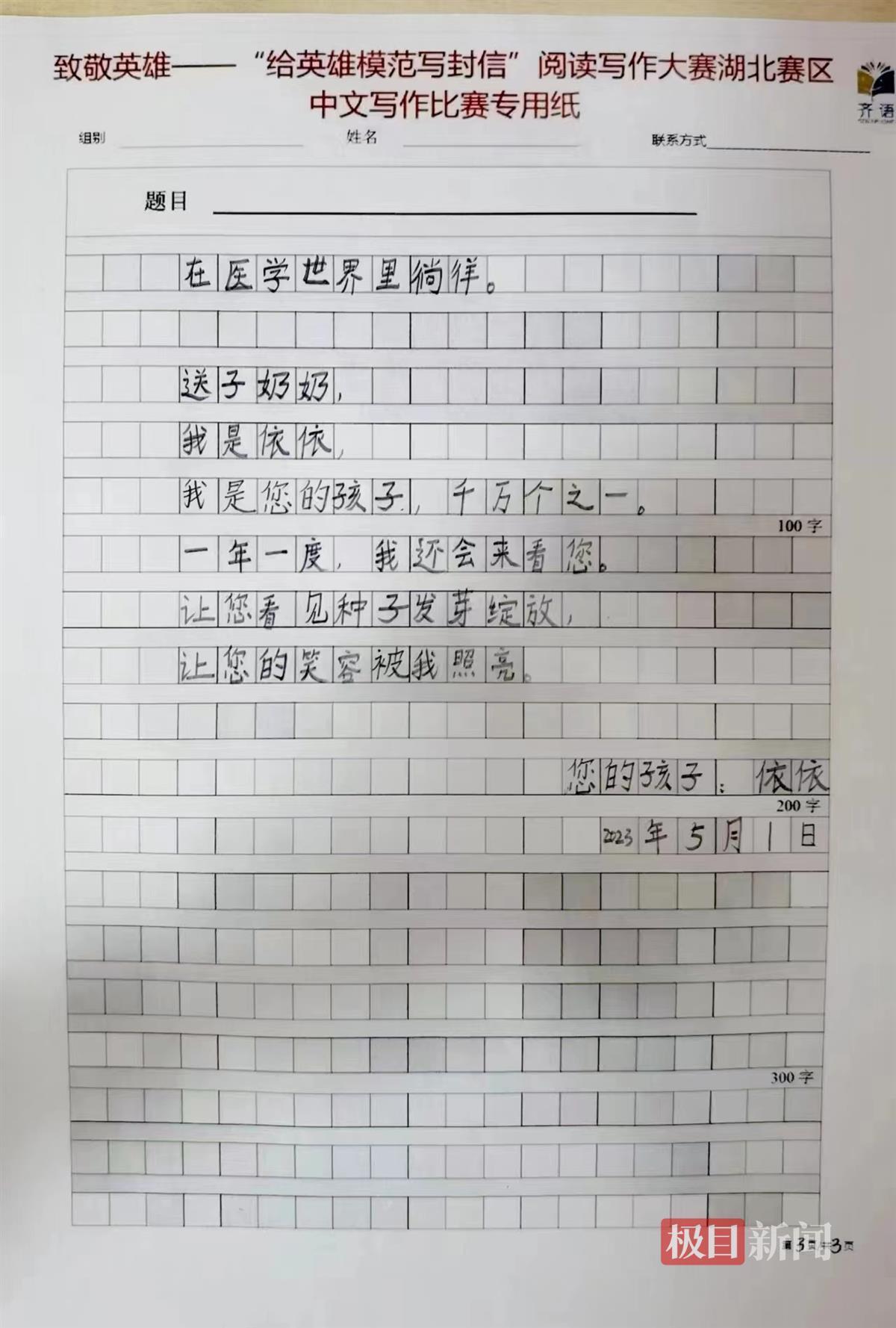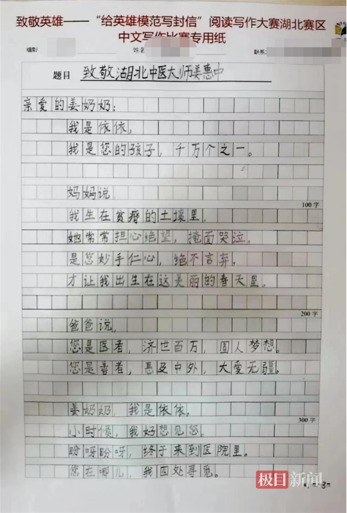 “自从那次见了姜奶奶,孩子感触很深。这次参加比赛,孩子看到题目‘英雄模范’就想到了姜奶奶,也就有了这篇获奖作文。”熊先生说。依依说,以后长大了想成为姜奶奶这样的医者,温柔仁爱,治病救人,在平凡的岗位上将工作做到极致,成为不平凡的人。