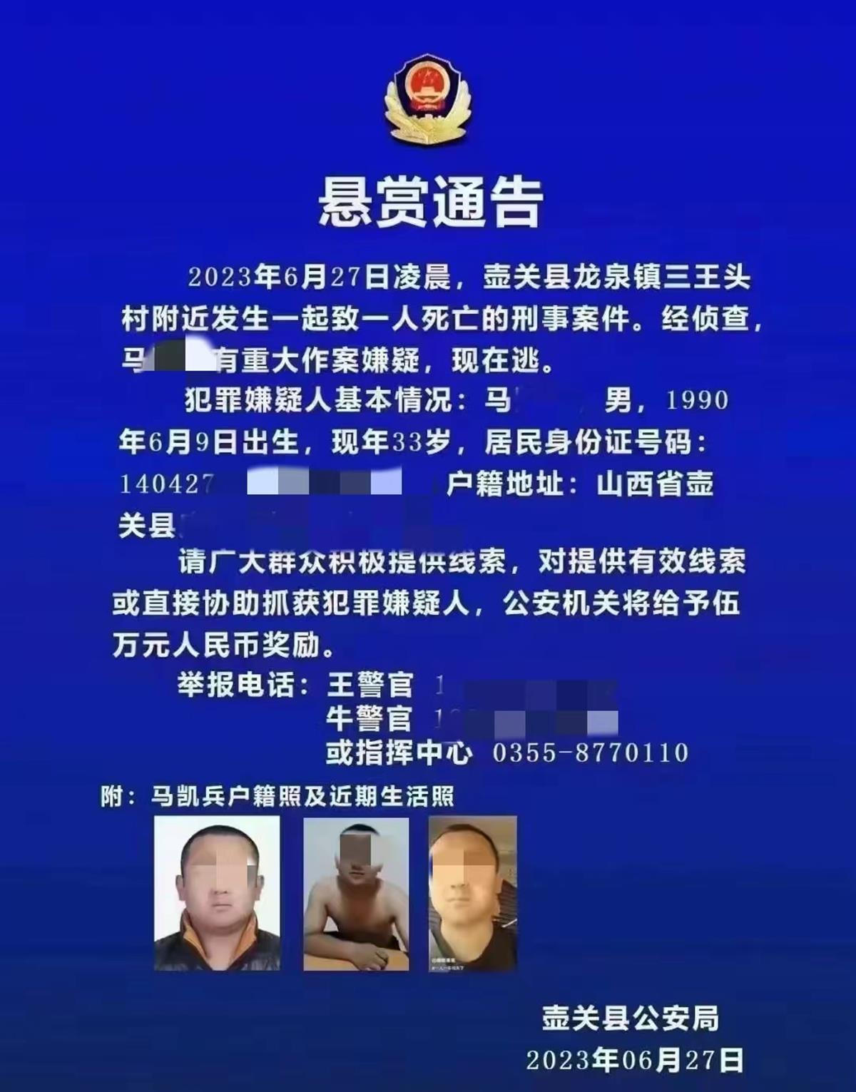 27日,壶关县公安局发布悬赏通告:6月27日凌晨,壶关县龙泉镇三王头村附近发生一起致一人死亡的刑事案件。经侦查,马某某有重大作案嫌疑,现在逃。对提供有效线索或直接协助抓获犯罪嫌疑人的人员,公安机关将给予5万元奖励。