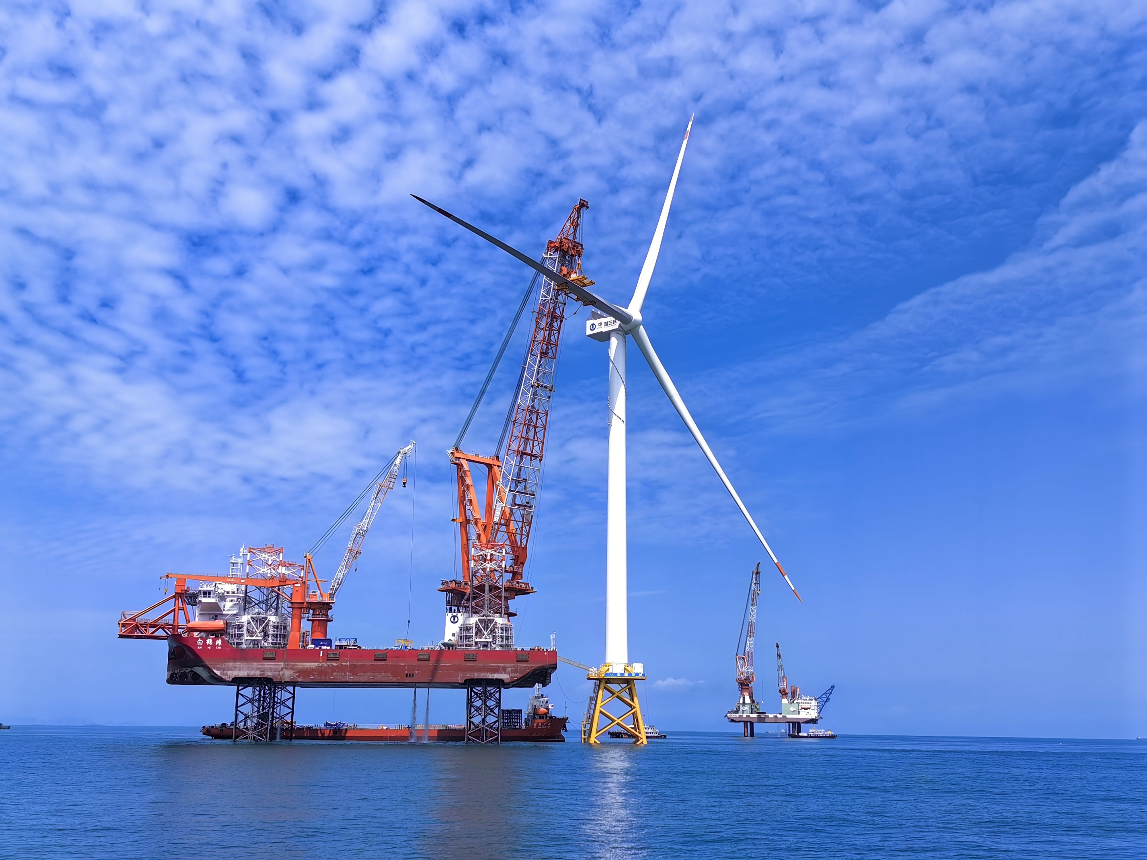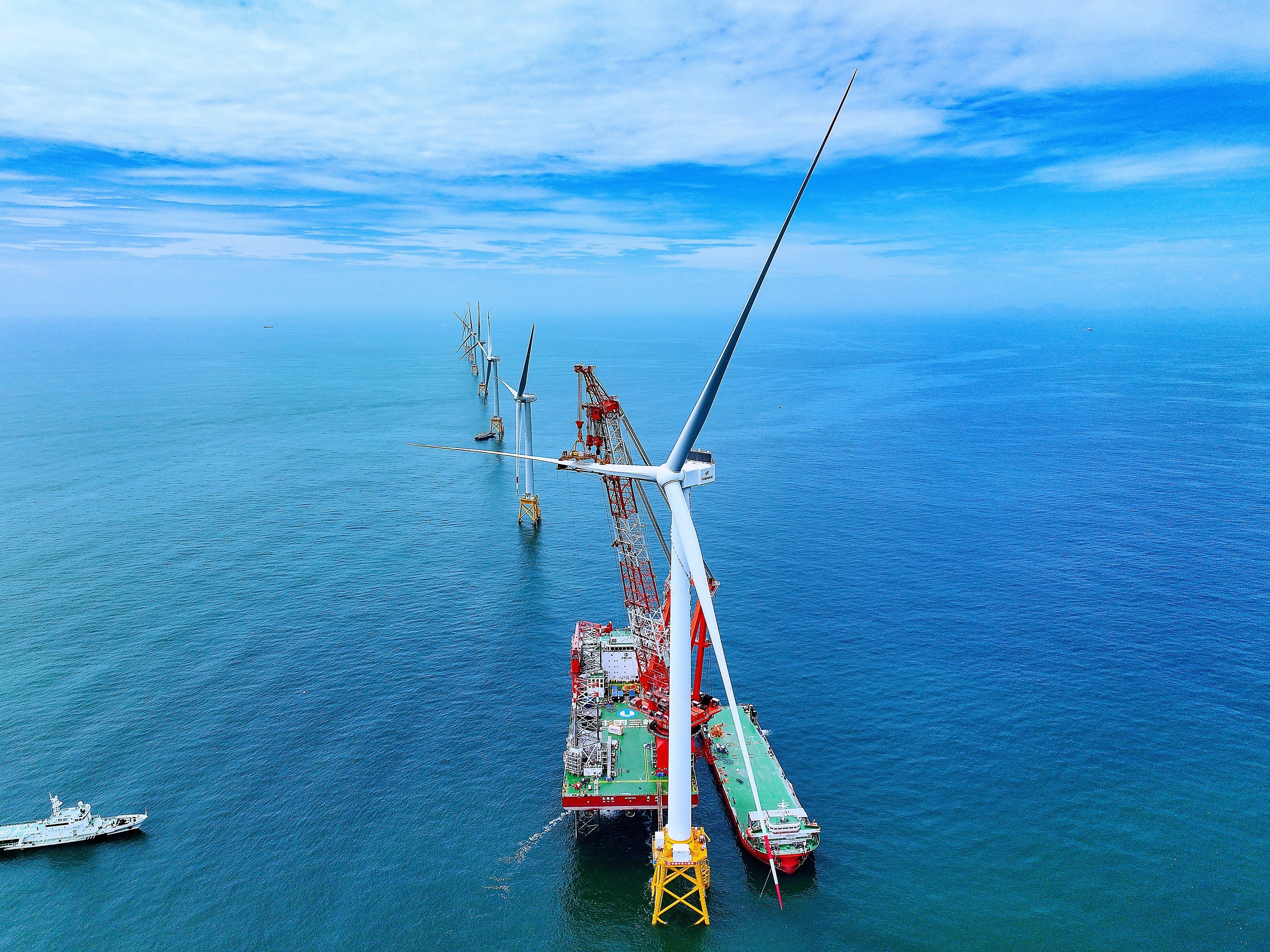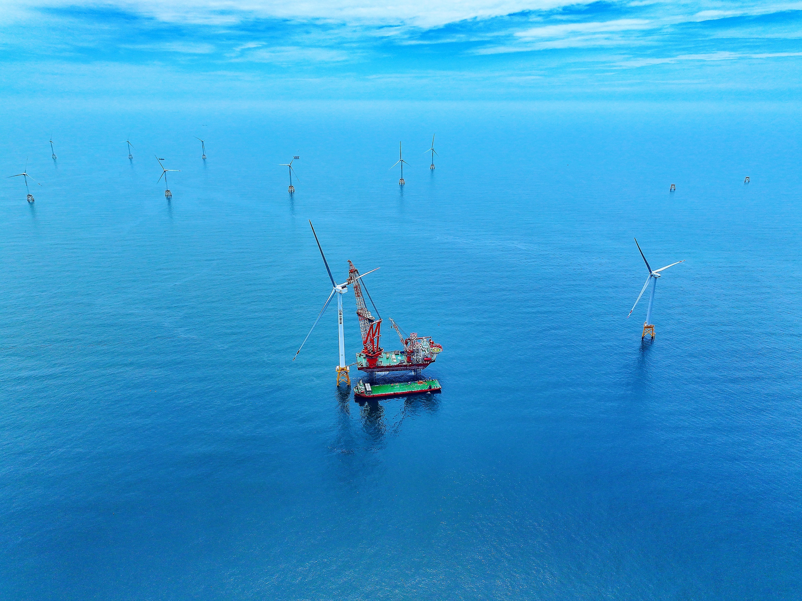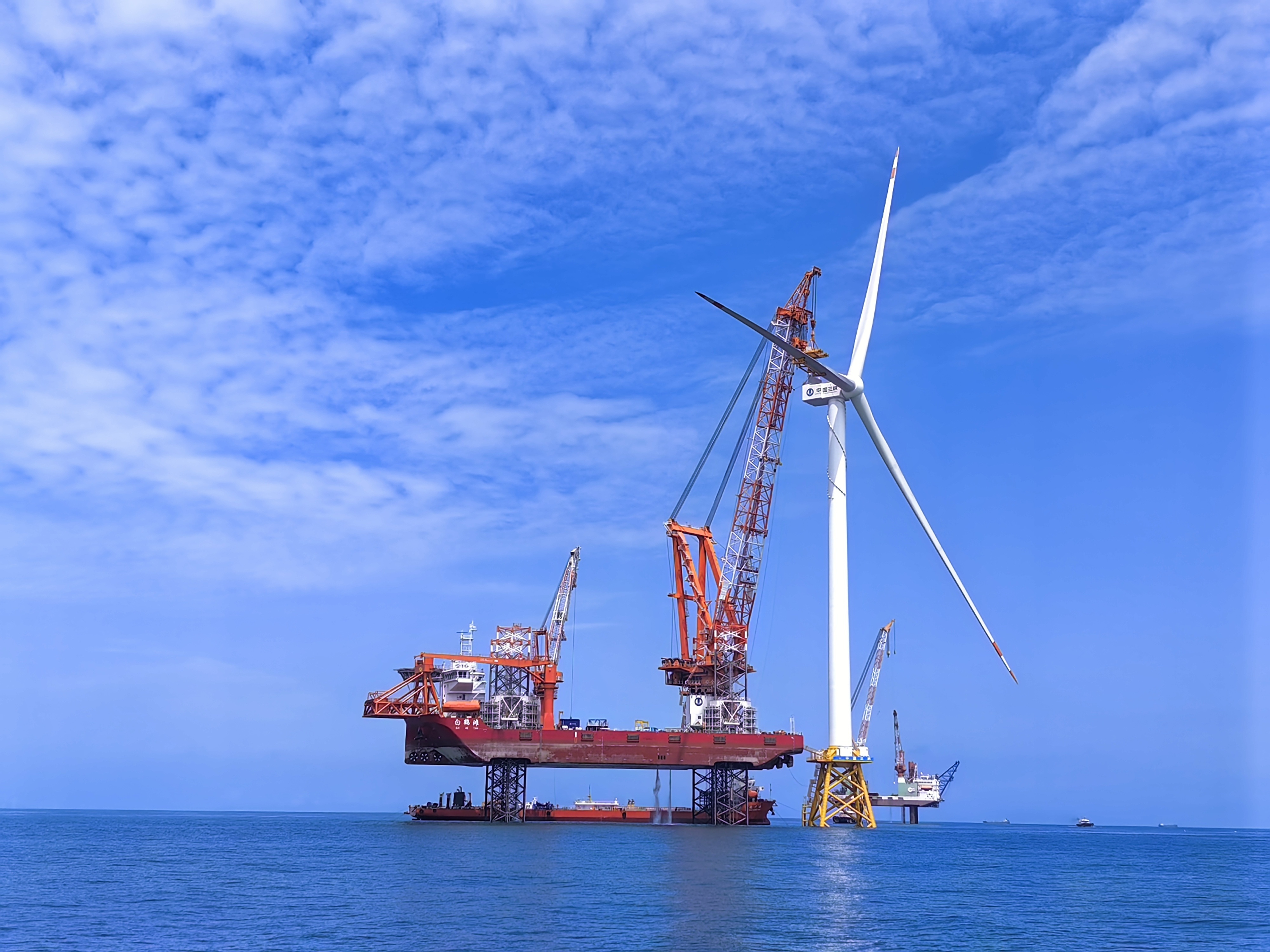 6月28日,16兆瓦海上风电机组吊装完成。航拍照片,本报记者刘晓宇 摄