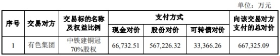 根据坤元评估出具并经有色集团备案的《评估报告》,截至评估基准日2022年6月30日,中铁建铜冠股东全部权益价值为953,321.55万元,据此计算,本次标的资产中铁建铜冠70%股权对应权益价值为667,325.09万元。交易双方经协商同意,本次标的资产的交易价格以经有色集团备案的评估值为基础,由交易各方协商确定为667,325.09万元。铜陵有色以发行股份方式支付的交易对价为567,226.32万元,占交易价格的85%;以发行可转换公司债券方式支付的交易对价为33,366.26万元,占交易价格的5%;以现金方式支付交易对价为66,732.51万元,占交易价格的10%。