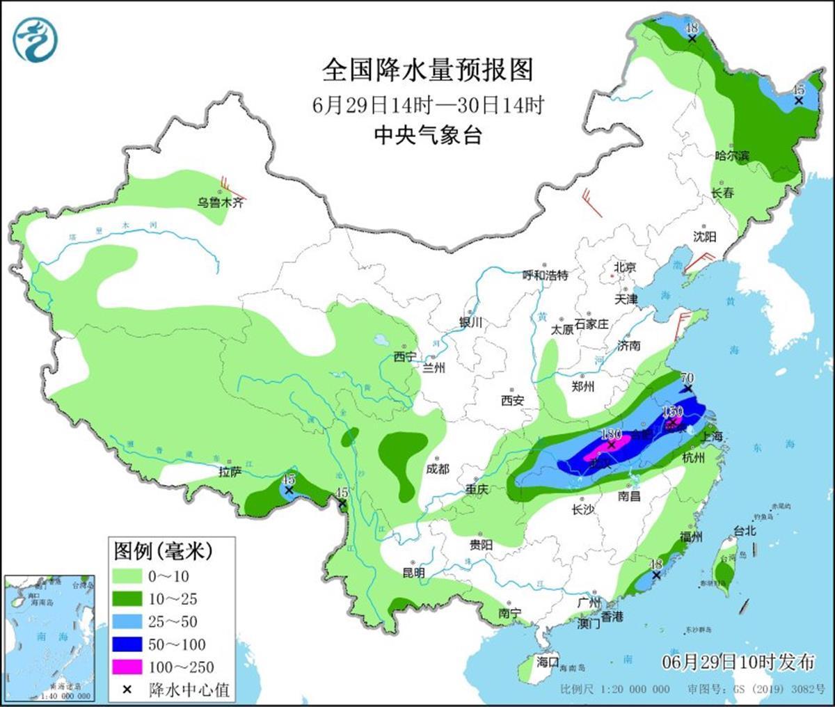全国来看,中央气象台今晨继续发布暴雨蓝色预警和强对流天气黄色预警:今天(29日),黄淮南部、江淮、江汉中南部、江南北部、重庆东部以及黑龙江北部、内蒙古东北部等地部分地区有大到暴雨,其中,湖北东部等地局地有大暴雨(100—150毫米)。上述部分地区伴有短时强降水(最大小时降雨量30—50毫米,局地可超过70毫米),黑龙江中部、安徽中南部、江苏中南部、上海西北部、湖北东部等地的部分地区将有8—10级雷暴大风或冰雹天气,局地风力11级,江苏中南部局地可能伴有龙卷。