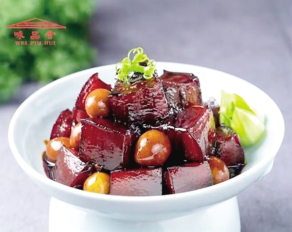 农家红烧肉:选用优质猪五花肉,加陈年花雕酒,小火煨制2小时,再配上鹌鹑蛋,酒香味浓郁,肥而不腻。