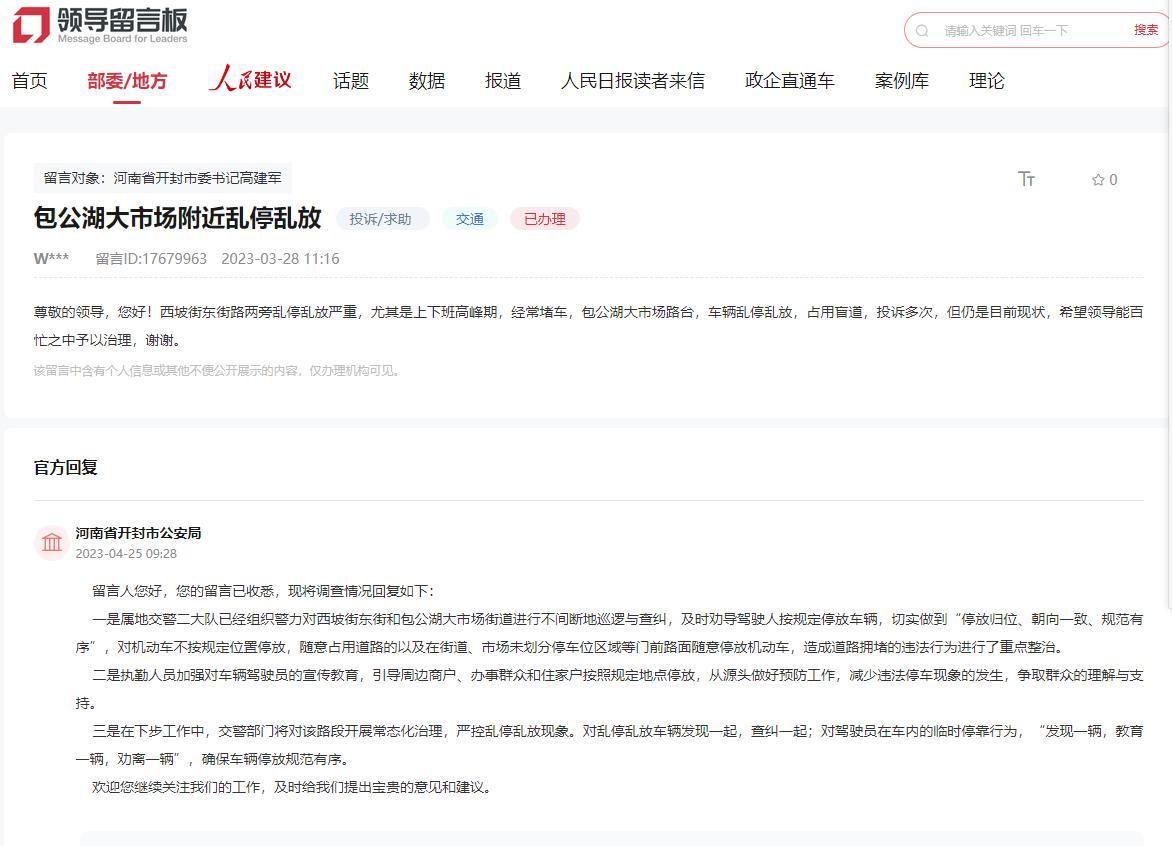 机动车辆乱停乱放不仅破坏了市容市貌,还扰乱了群众的居住环境秩序。近日,有网民在人民网“领导留言板”上反映机动车乱停乱放的问题得到了解决和回复。