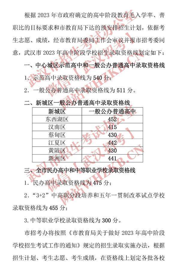 湖北日报讯 (记者张倩倩)7月1日16时,“武汉招考”官方微信公众号发布2023年武汉市高中阶段学校招生录取资格线,详情如下。