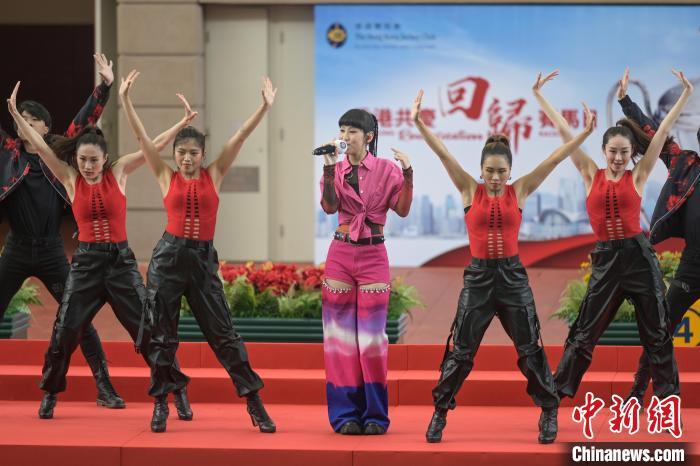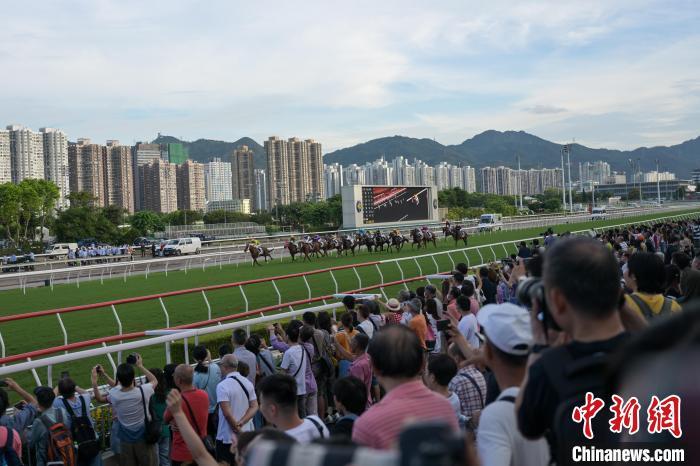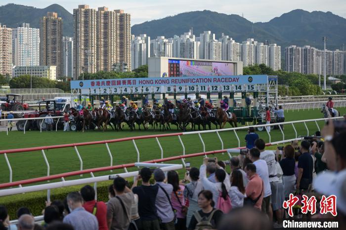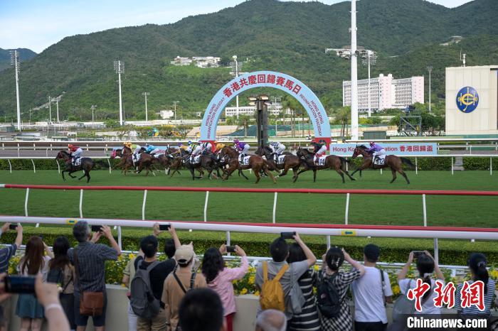 7月1日,香港赛马会在沙田马场举行“香港共庆回归赛马日”,共有10场黄昏赛事,吸引众多市民和游客到场。其中,“香港回归杯”由马匹知足常乐胜出,而“粤港杯”则由马匹威之星胜出。(记者 陈永诺)