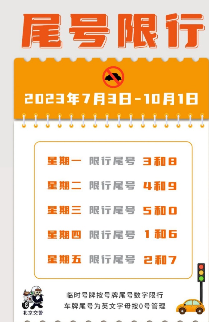 从7月3日开始,北京工作日小客车限行尾号轮换,周一至周五限行机动车车牌尾号分别为:3和8、4和9、5和0、1和6、2和7。预计下周工作日早晚高峰期间,城区环路、联络线以及部分桥区节点车流量大;工作日晚间和周末大型商圈周边部分道路交通压力较大。