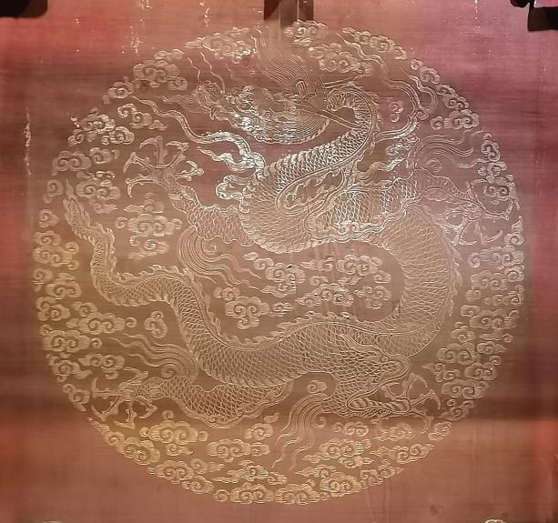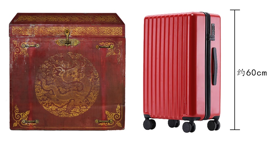 △ 戗(qiàng)金云龙纹朱漆盝(lù)顶箱与一个24寸行李箱的高度差不多