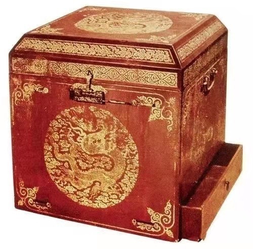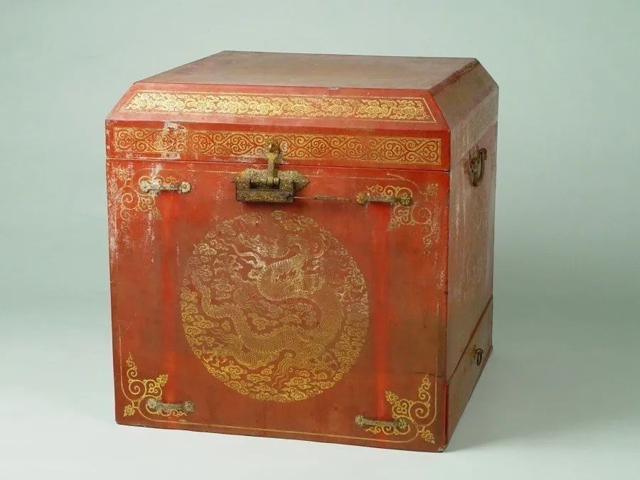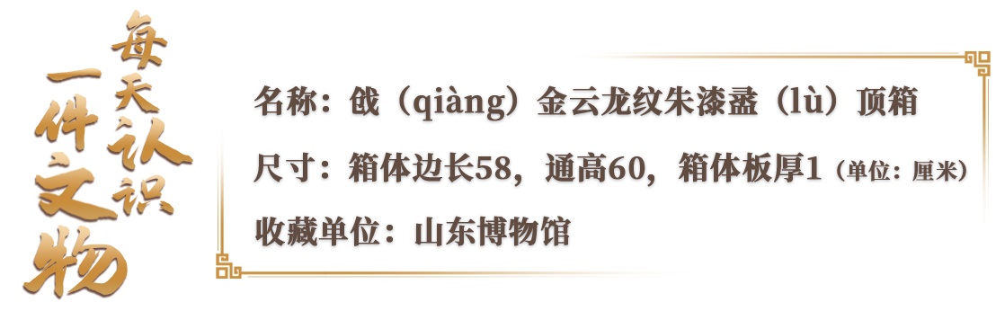 戗(qiàng)金云龙纹朱漆盝(lù)顶箱形体较大