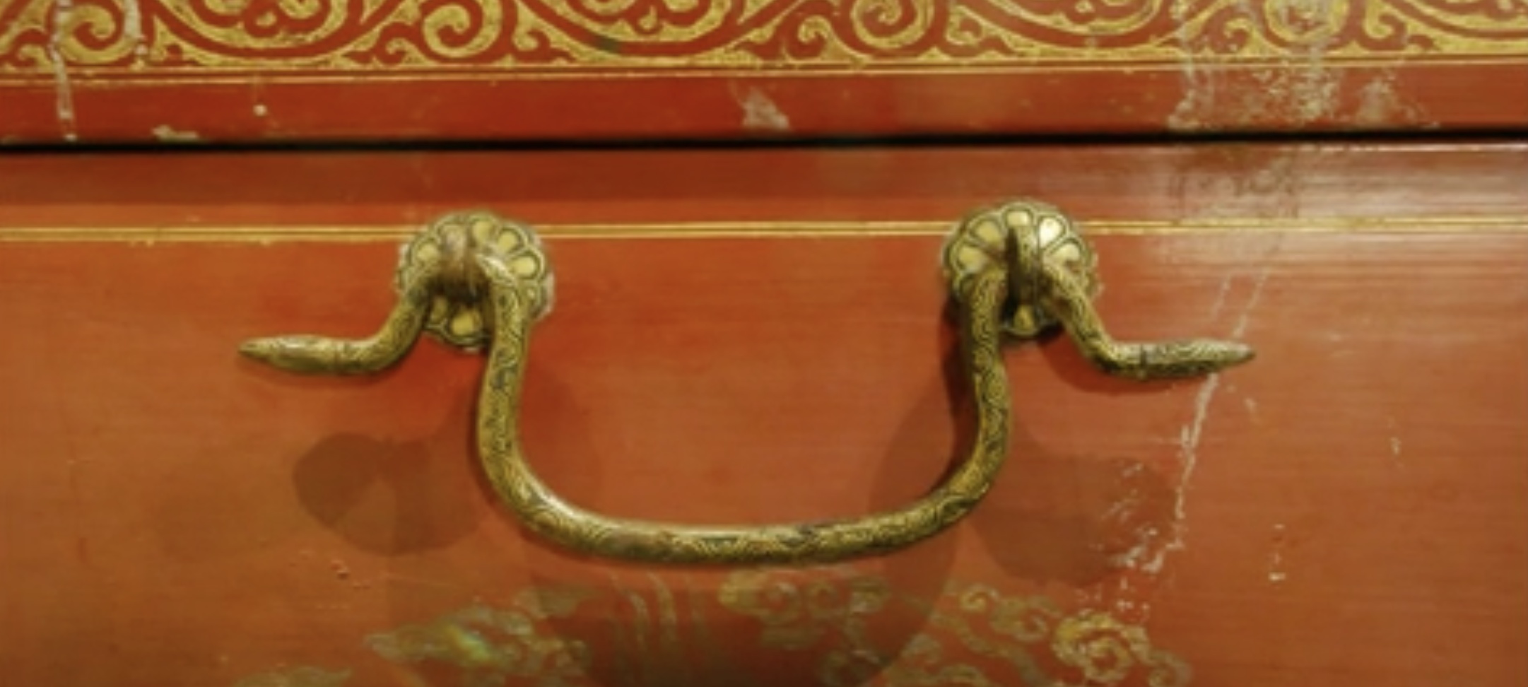 木箱左右两侧上部的蛇形描金提梁(把手)