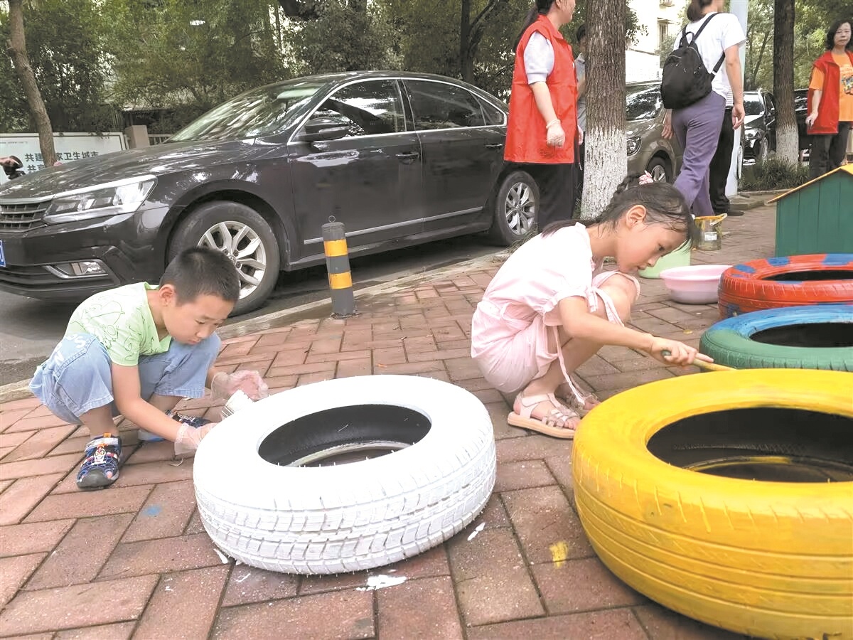 7月2日,走进武汉市东西湖区常青花园第二社区旁的“迷你零碳花园”,可见各种彩色涂装花箱、废弃轮胎变身“彩虹圈”成了花园装饰。这是社区居民一起动手改造的旧物,让这座小花园焕然一新。