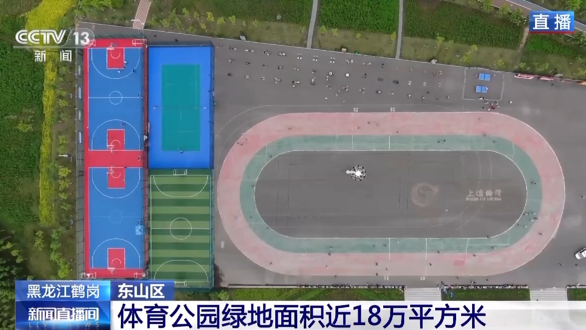 这里是鹤岗市东山区的一个体育公园。从空中视角,我们可以看到公园满眼绿色,整个公园占地面积约53万平方米,公园绿地面积近18万平方米。因为栽种的植物不同,所以整个绿地呈现出由浅至深的颜色变化,中间还有不同颜色的花朵点缀。园林部门的工作人员介绍,这个公园种植的乔灌木有38种32万多株,花卉有13种480多万株。