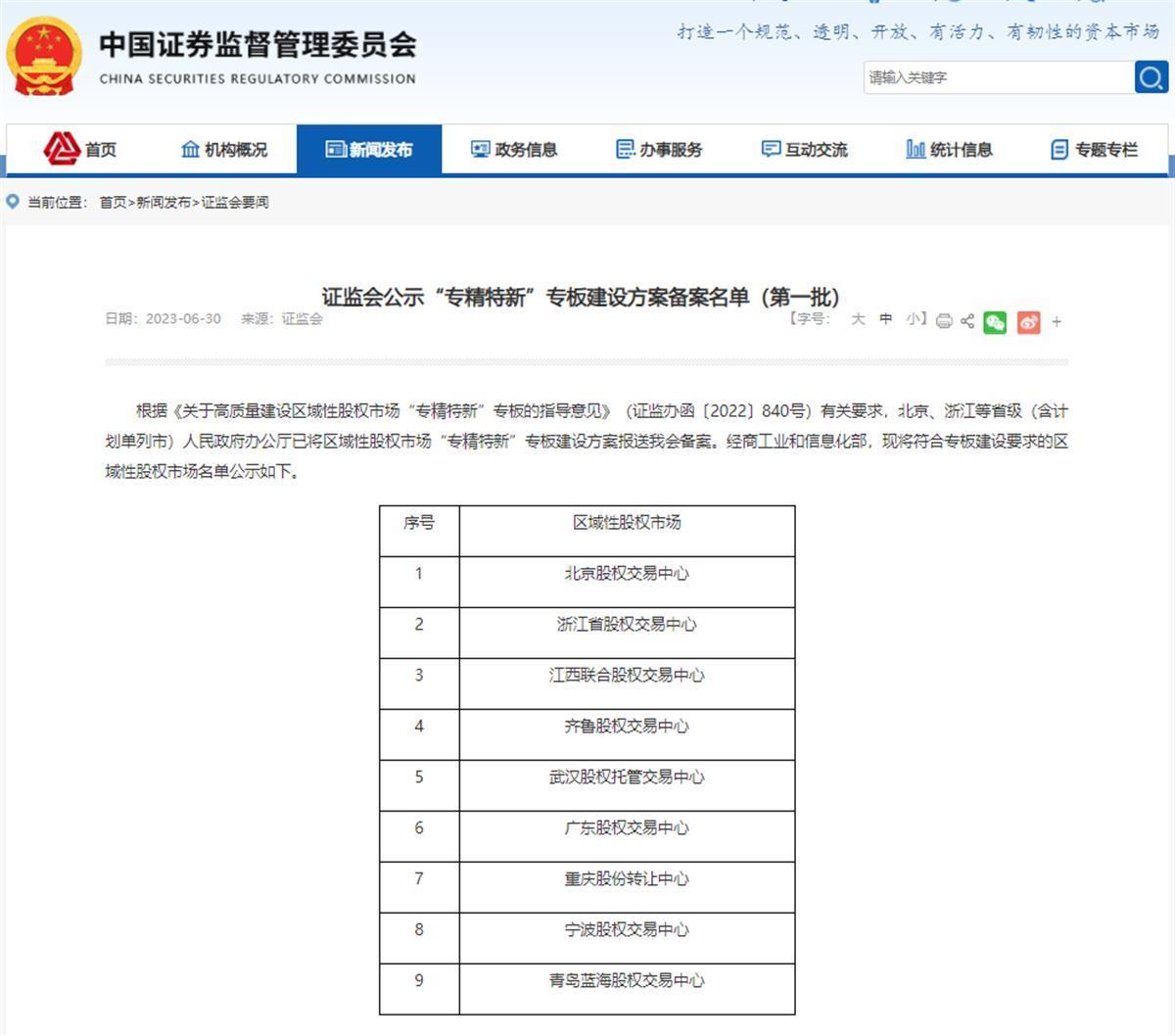 近日,中国证监会发布第一批“专精特新”专板建设方案公示名单,武汉股权托管交易中心等9家区域性股权市场入选。