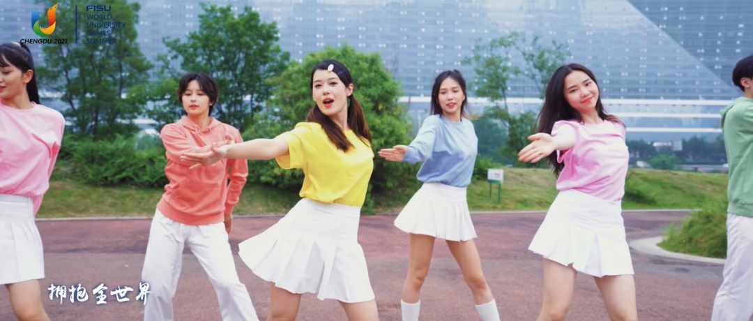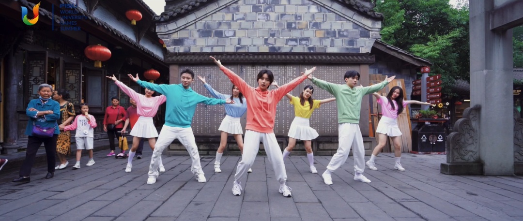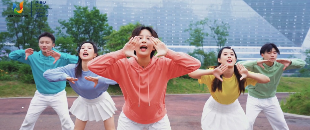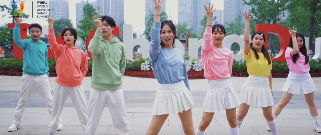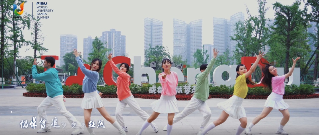 镜头一转,青年舞者在城市间穿梭起舞,相同的舞步、不同的场景,视频以焕然一新的方式,让青年们与成都“碰”出更多火花,用青春的活力为大运喝彩。