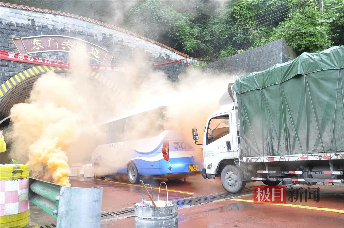 本次应急救援演练采取“情景模拟、实战演练”方式,在东门关隧道出口处模拟因连续暴雨导致隧道出口上方塌方,砸中途经客车,导致一名乘客受伤昏迷,同时后方运送快递货车因避让不及追尾客车,导致客车漏油,引发车辆燃烧的突发事件。
