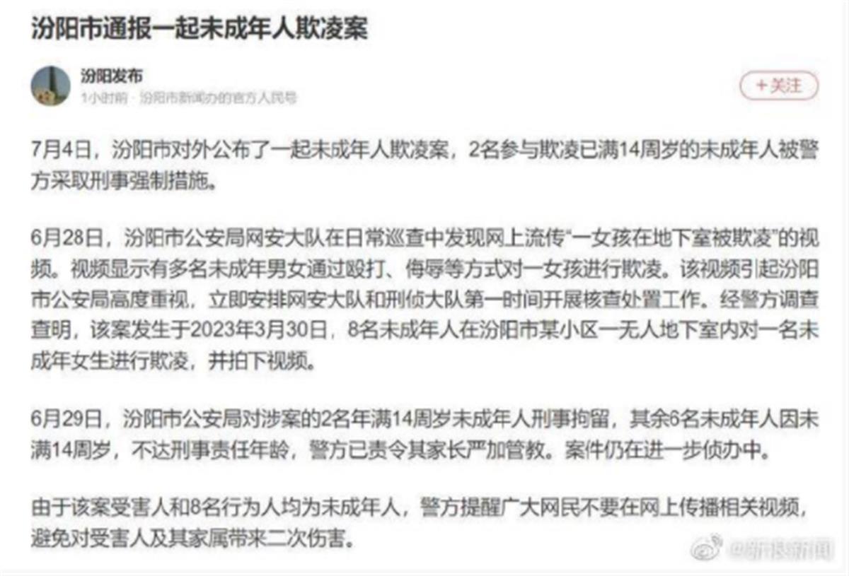 7月4日晚上,头条号“汾阳发布”公布一起未成年人欺凌案,2名参与欺凌的已满14周岁的未成年人被警方采取刑事强制措施,其余6名未成年人因未满14周岁,不达刑事责任年龄,警方已责令其家长严加管教。案件仍在进一步侦办中。(据7月4日澎湃新闻)