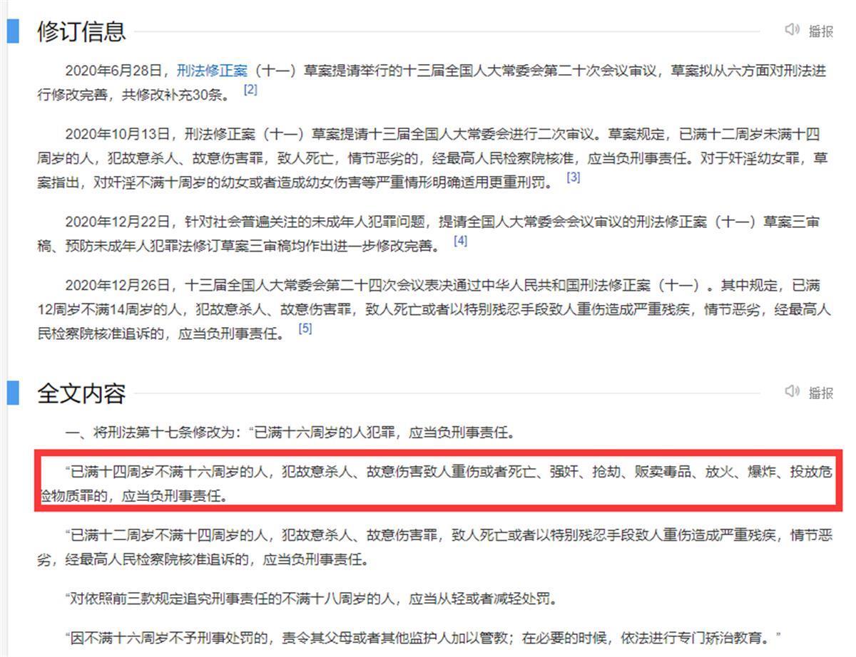 2021年3月1日起施行的刑法修正案(十一)明确规定,已满十四周岁不满十六周岁的人,犯故意杀人、故意伤害致人重伤或者死亡、强奸、抢劫、贩卖毒品、放火、爆炸、投放危险物质罪的,应当负刑事责任。已满十二周岁不满十四周岁的人,犯故意杀人、故意伤害罪,致人死亡或者以特别残忍手段致人重伤造成严重残疾,情节恶劣,经最高人民检察院核准追诉的,应当负刑事责任。