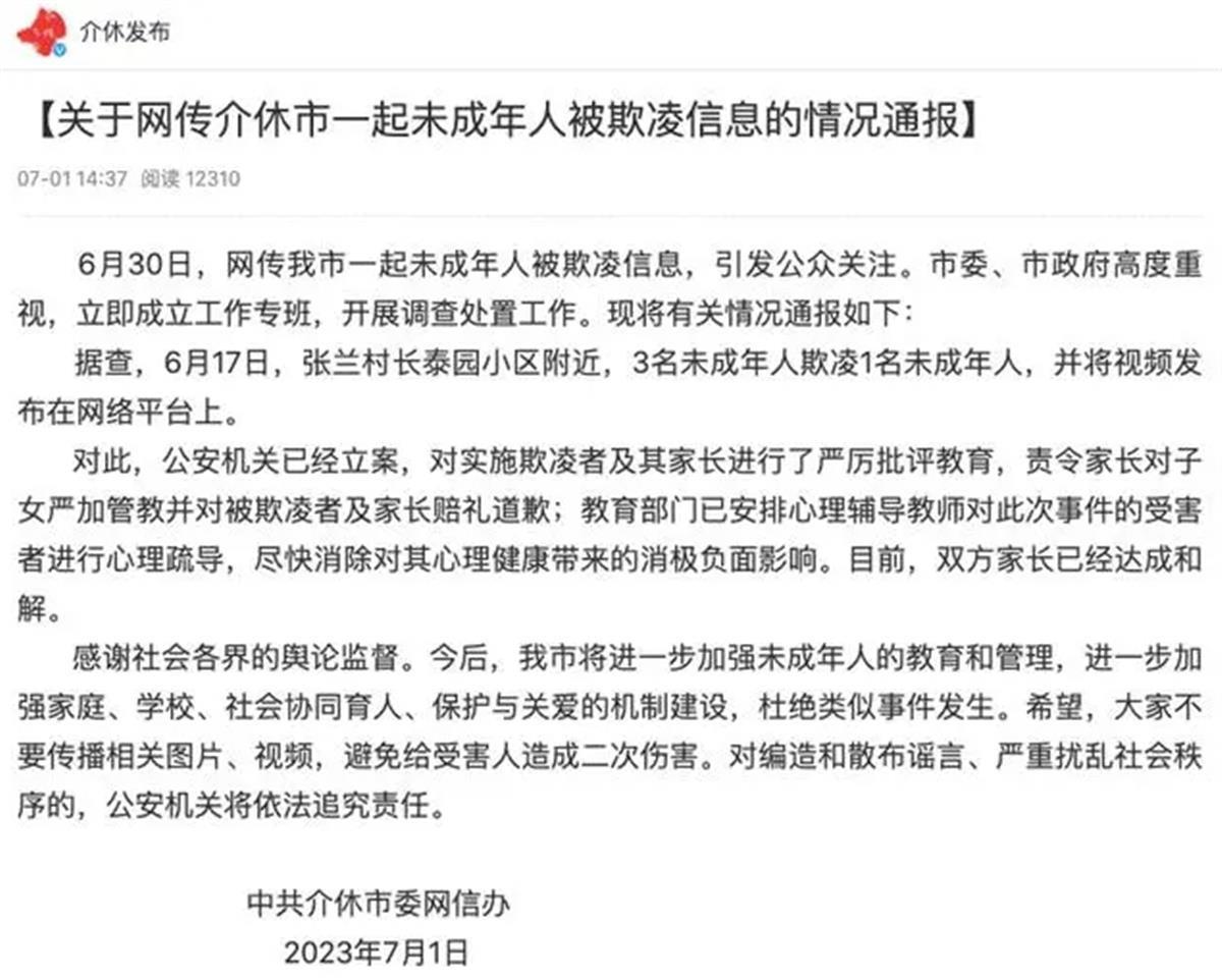日前,一段“小男孩被逼吃粪便”的视频在社交平台引发热议,涉事的山西介休发布通报称,本案系“3名未成年人欺凌1名未成年人”,警方对施害方监护人“严厉批评教育”,责令严加管教并赔礼道歉,目前“双方家长已达成和解”。