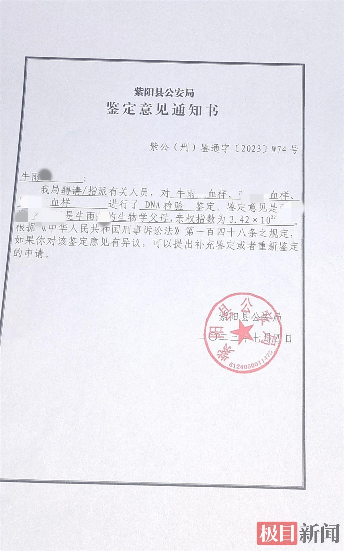 “之前还到祖籍地找过亲生父母的线索,毫无收获,这次得知消息后,一夜未眠。”7月5日,牛雨航告诉极目新闻记者,7月4日他从紫阳县公安局拿到了DNA鉴定报告。