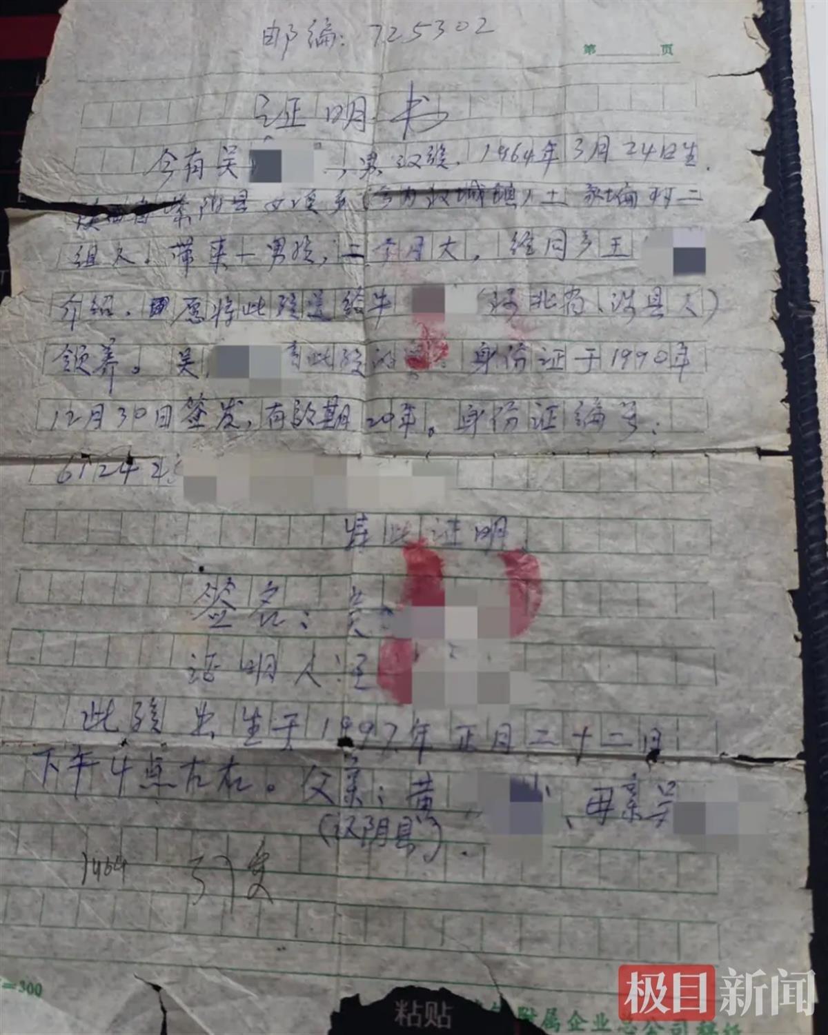 极目新闻此前报道,1997年,陕西紫阳县吴某某等人把一名几个月大的男婴带到河北邯郸涉县,交由杨女士夫妇收养。吴某某等人索要了9000元抚养费,并留了一张写有男婴亲生父母姓名、居住地的字据作为证明。