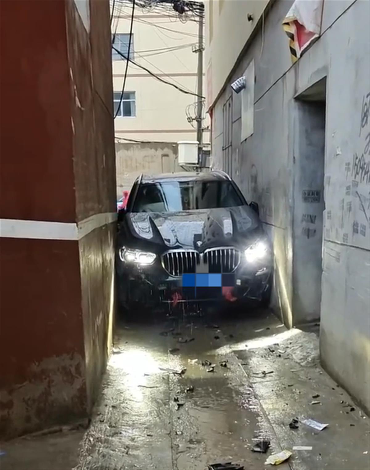 网友拍摄的视频显示,天下着小雨,一辆定西牌照的黑色宝马SUV卡在两栋房子之间动弹不得,车的前灯还亮着。另一段视频显示,天已放晴,一辆救援车辆将宝马倒着从巷内拉了出来,其车头和侧身破损较严重。