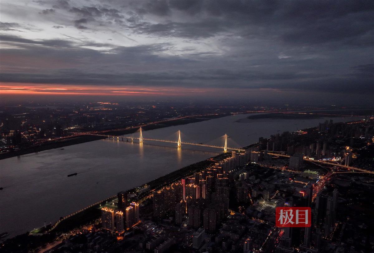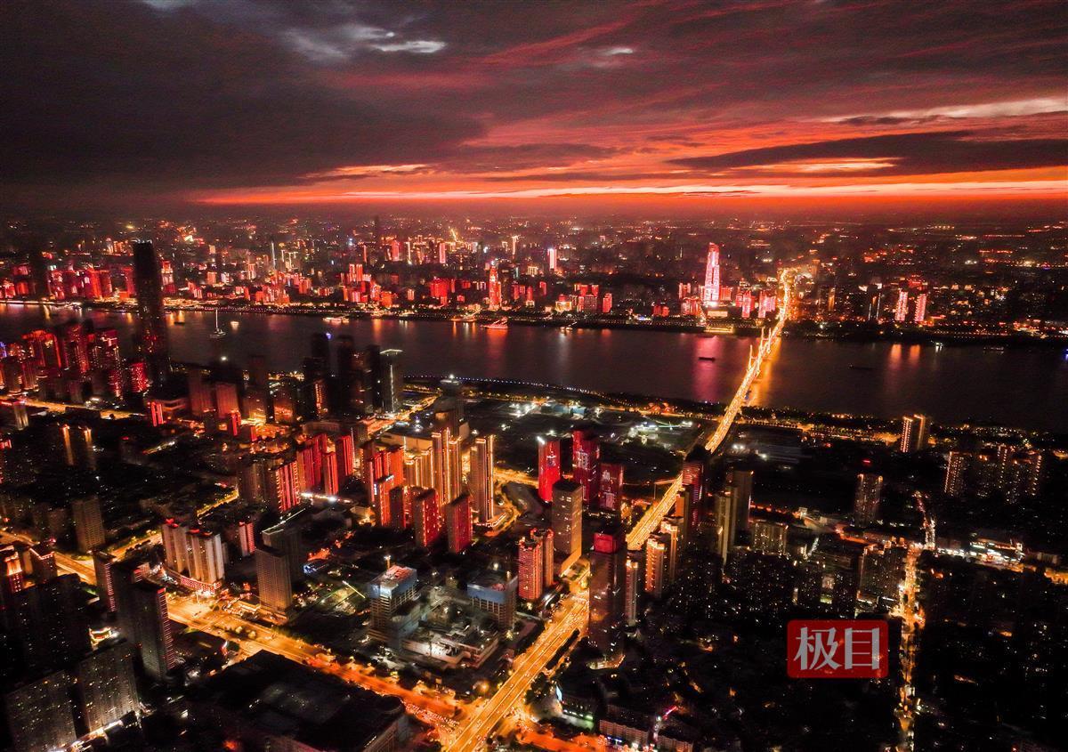 7月4日,武汉天气晴好,天空透彻湛蓝,傍晚时分,夕阳西下,晚霞映红江城,燃烧的云朵,在天空中绽放出绚丽多彩的光芒,整座城市笼罩在一片红色之中,美轮美奂。