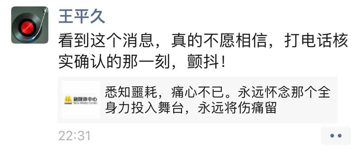 5日晚21:46,电影频道节目中心副总编辑,第36届大众电影百花奖颁奖晚会总策划王平久在朋友圈透露悲痛之情,表示打电话核实确认(李玟去世消息)的那一刻“(忍不住)颤抖”,“没想到你会这样离去,去年武汉《刀马旦》一别,竟成永远!这次去香港还说找你,可是……”