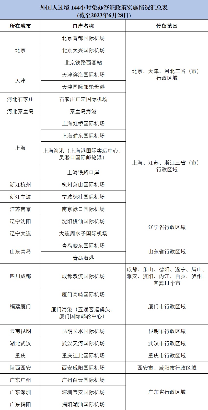 如外国人符合上述条件,可以向我国20个城市28个口岸的边检机关提出办理144小时过境免签申请,其他口岸暂未实施该项政策。