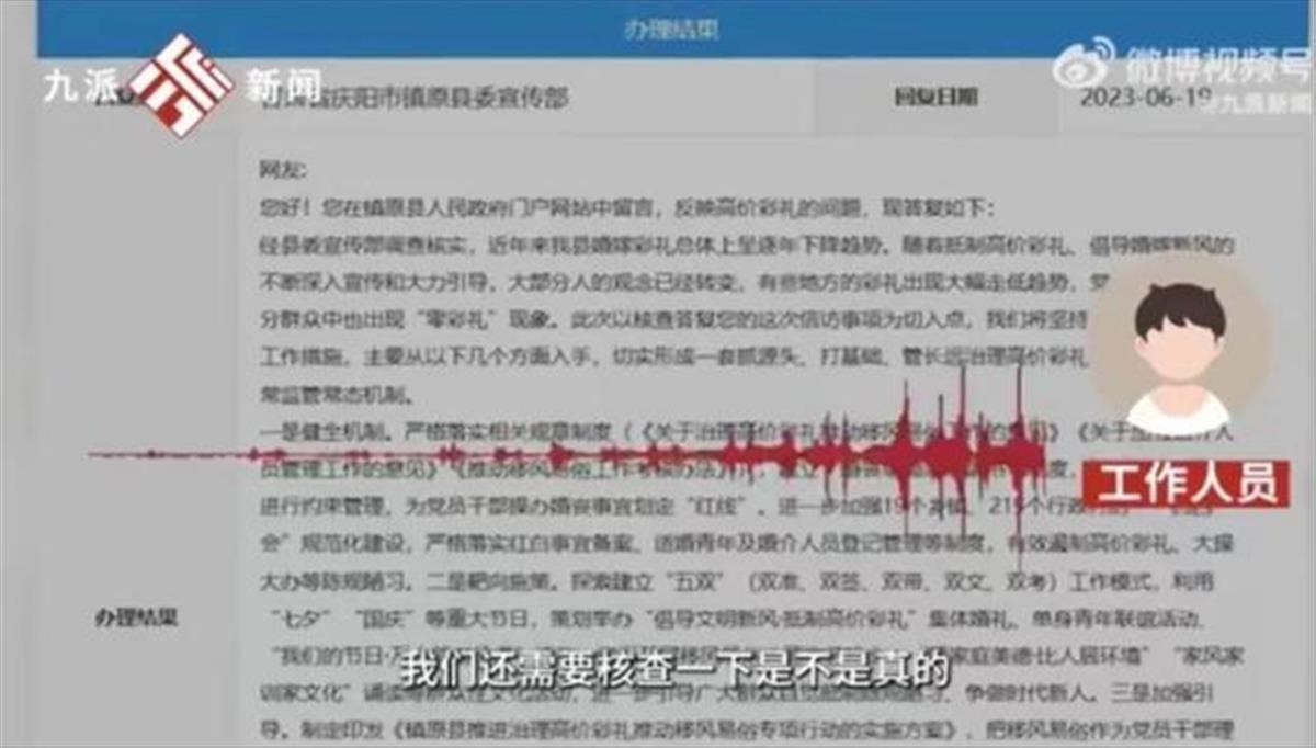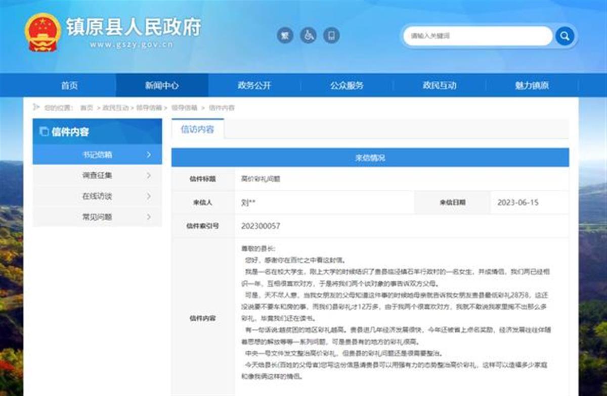 据此前报道,该网友在“领导信箱”的留言中称,自己是在校大学生,跟镇原县一女生相识一年,“互相很喜欢对方”,但将此事告知双方父母后,女方父母表示本县最低彩礼28.8万元,与自己所在县12万多元的彩礼相差较多,因此,该网友恳请镇原县整治高价彩礼,“这样可以造福多少家庭和像我俩这样的情侣。”