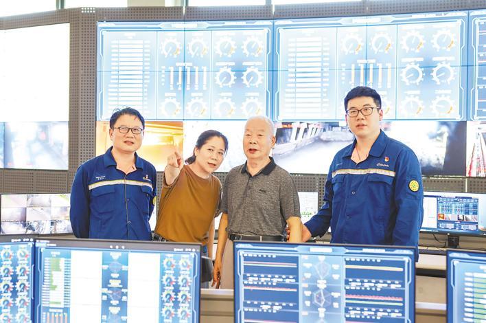 6月26日,裴英明(左三)在女婿雷志文(左一)、女儿裴兰(左二)、外孙雷明的陪伴下,参观鄂钢操业集控中心,细看鄂钢变化。(湖北日报全媒记者 薛婷 摄)