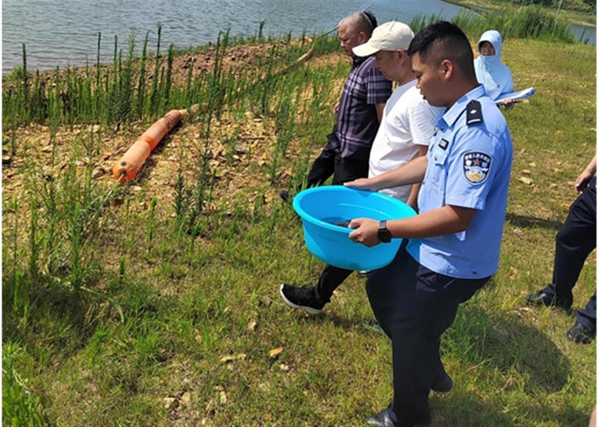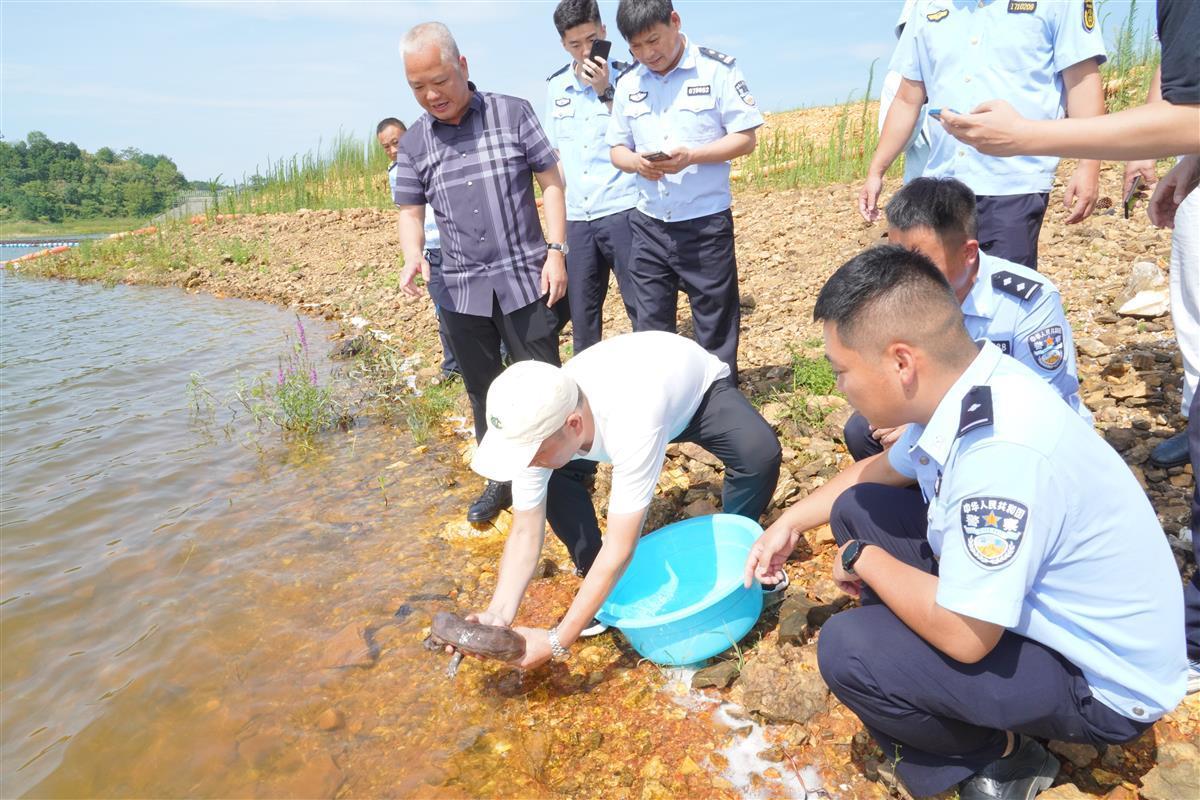 蕲春县公安局联合农村农业局、林业局等部门,前往该县鹞鹰岩水库放生娃娃鱼