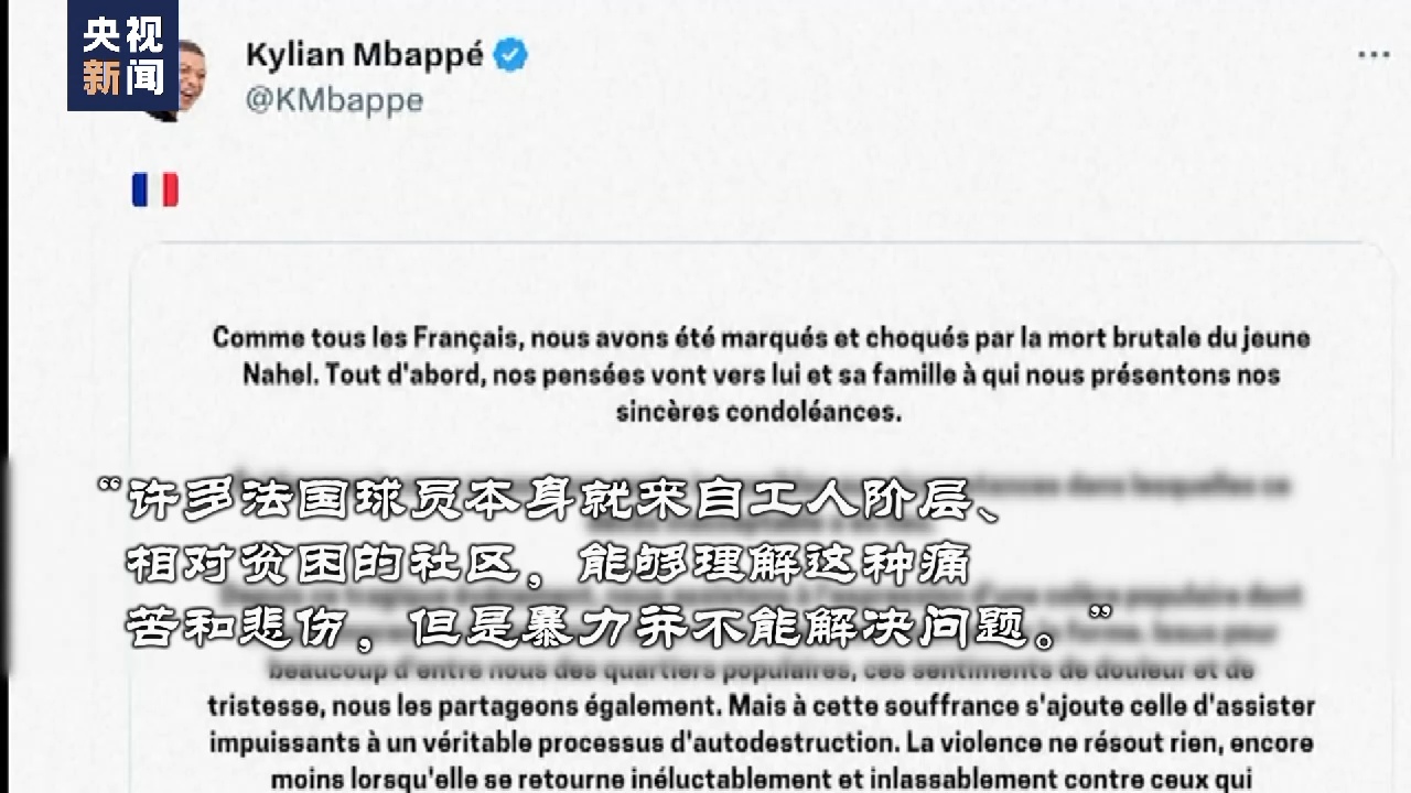 6月30日,卡塔尔世界杯“金靴奖”得主、法国球星姆巴佩在社交媒体上发布了法国国家队的共同声明。“许多法国球员本身就来自工人阶层、相对贫困的社区,能够理解这种痛苦和悲伤,但是暴力并不能解决问题。”