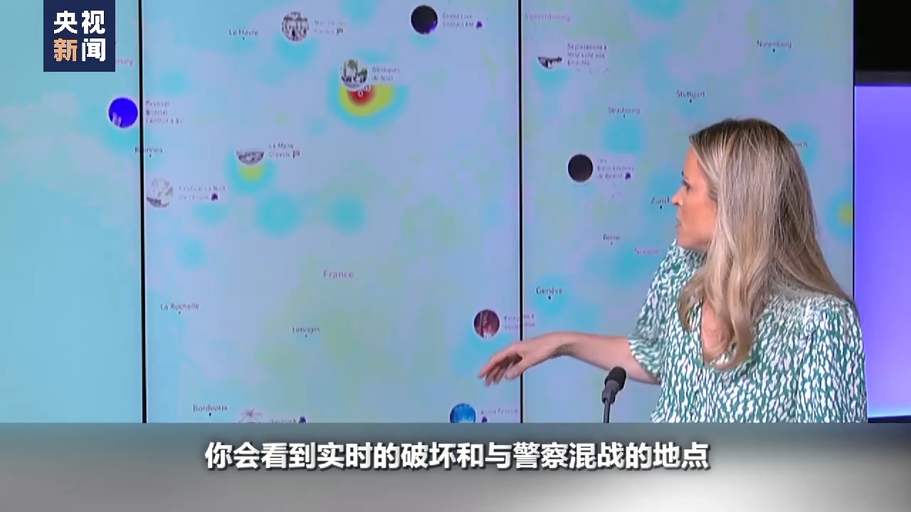 法兰西24新闻台记者 西格:比如,在Snapchat上有一种非常热门的功能——Snap地图,这是一个互动地图,你会看到实时的破坏和与警察混战的地点。我认为这轮骚乱非常重要的一点是,骚乱已经网络化,骚乱在社交媒体平台上进行直播,这是我们在早前2005年的骚乱中没有见过的特点。