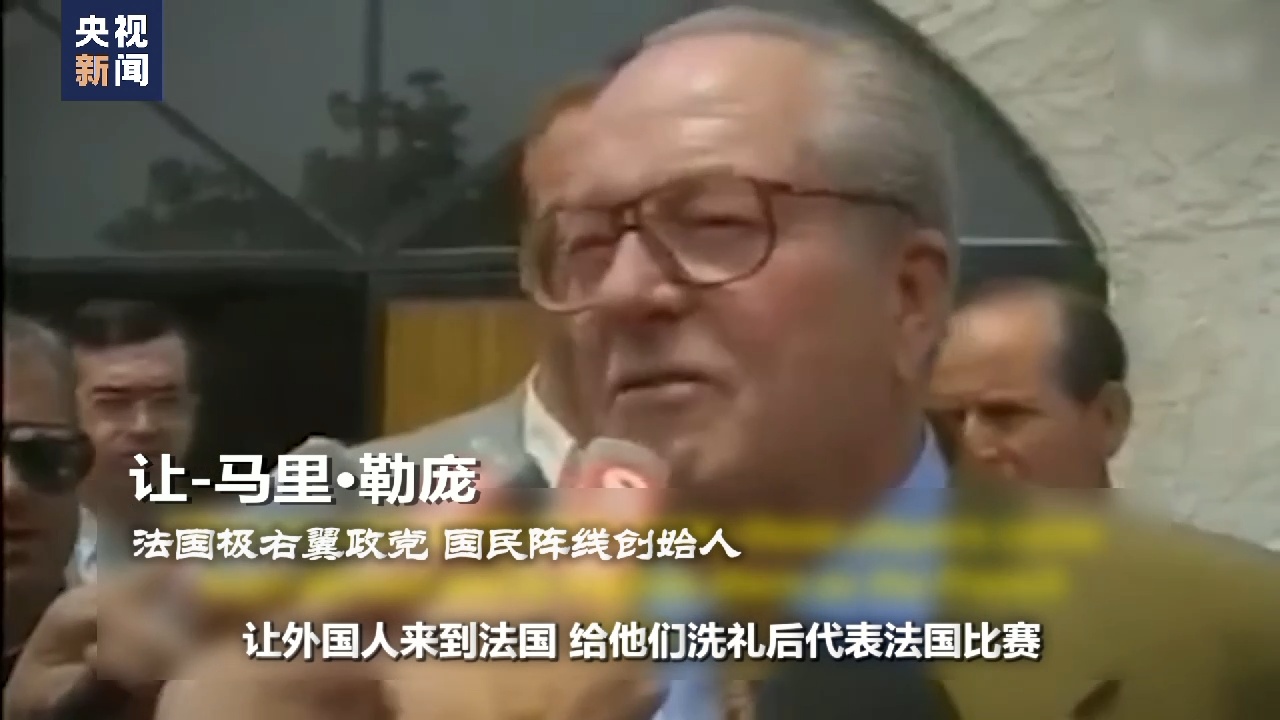 法国极右翼政党 国民阵线创始人 让-马里·勒庞:我觉得这是造假,让外国人来到法国,给他们洗礼后代表法国比赛。我注意到其他国家的球员,在高唱国歌时比我们的球员赤诚得多。事实上,大多数法国队的球员根本没有开口唱歌,可能他们不知道歌词是什么。