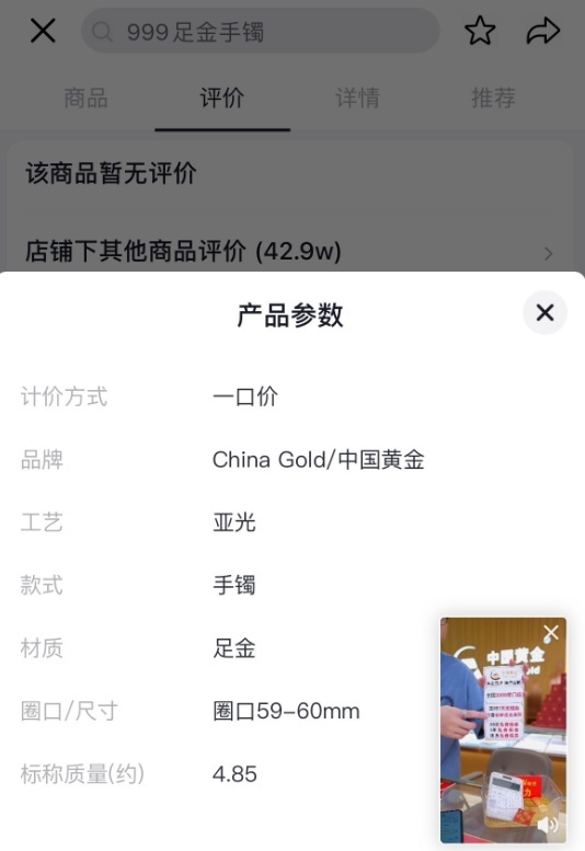 某中国黄金抖音直播间,主播宣称该手镯门店售价13999元,直播间享折上折仅售2599元,产品参数显示,实际仅重4.85克。