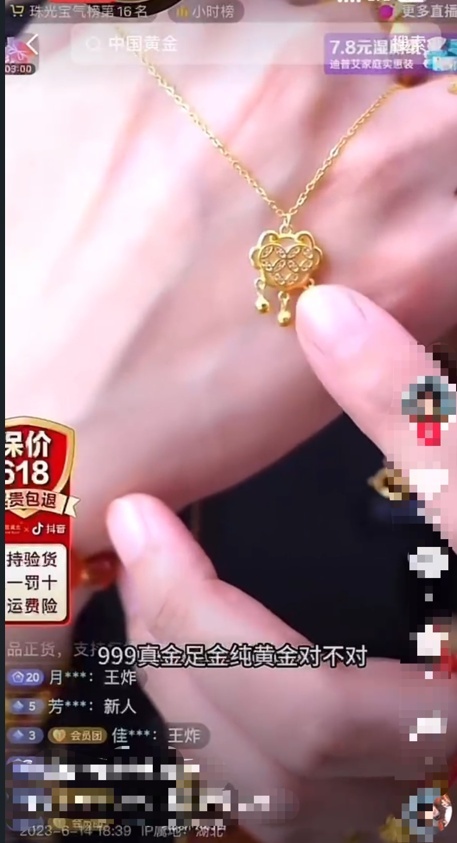 网友@ro*发文分享说,她在抖音某中国黄金直播间听主播激情宣讲了半个小时,本着先拍下占便宜的心理,付款了四五件分别价值99元、299元、399元的商品。高涨的情绪过后,意识到不对的该网友立马点进详情页,一件件审核已买商品,发现99元的那件并不是主播说的足金,而是银,价值299元和399元的金珠含金量仅0.03克。若按照当时的金价来算,她不仅没捡到便宜,还亏了。