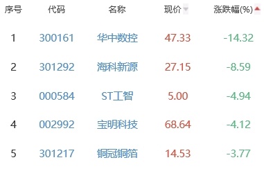 华中数控、海科新源、ST工智、宝明科技、铜冠铜箔位列涨幅榜后五位,涨幅分别为-14.32%、-8.59%、-4.94%、-4.12%、-3.77%。