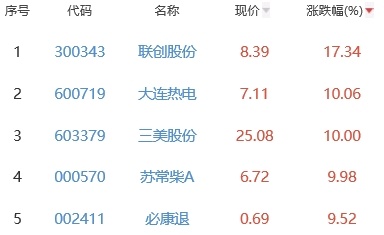 其中,联创股份、大连热电、三美股份、苏常柴A、必康退位列板块涨幅前五位,涨幅分别为17.34%、10.06%、10.00%、9.98%、9.52%。