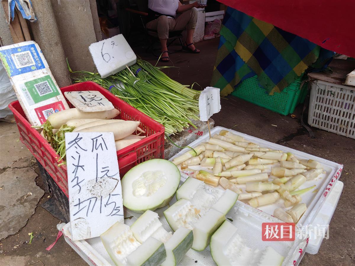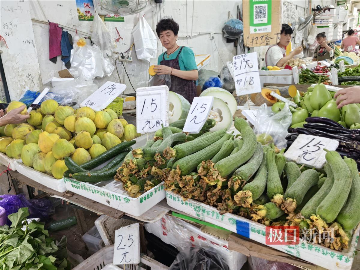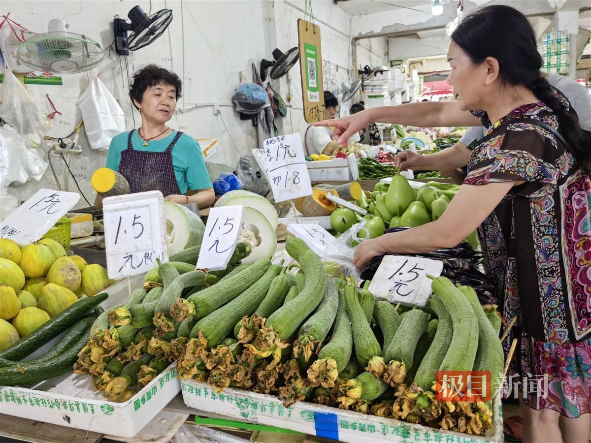 比叶子菜更受欢迎的是各种瓜果类蔬菜——它们既是夏天的主打时令菜,也是当下“1元菜”最集中的品类。一位市民挑了两根黄瓜、两根瓠子、一截冬瓜,最后只花了6块多钱:“都是1块多钱一斤的菜,便宜得很。”