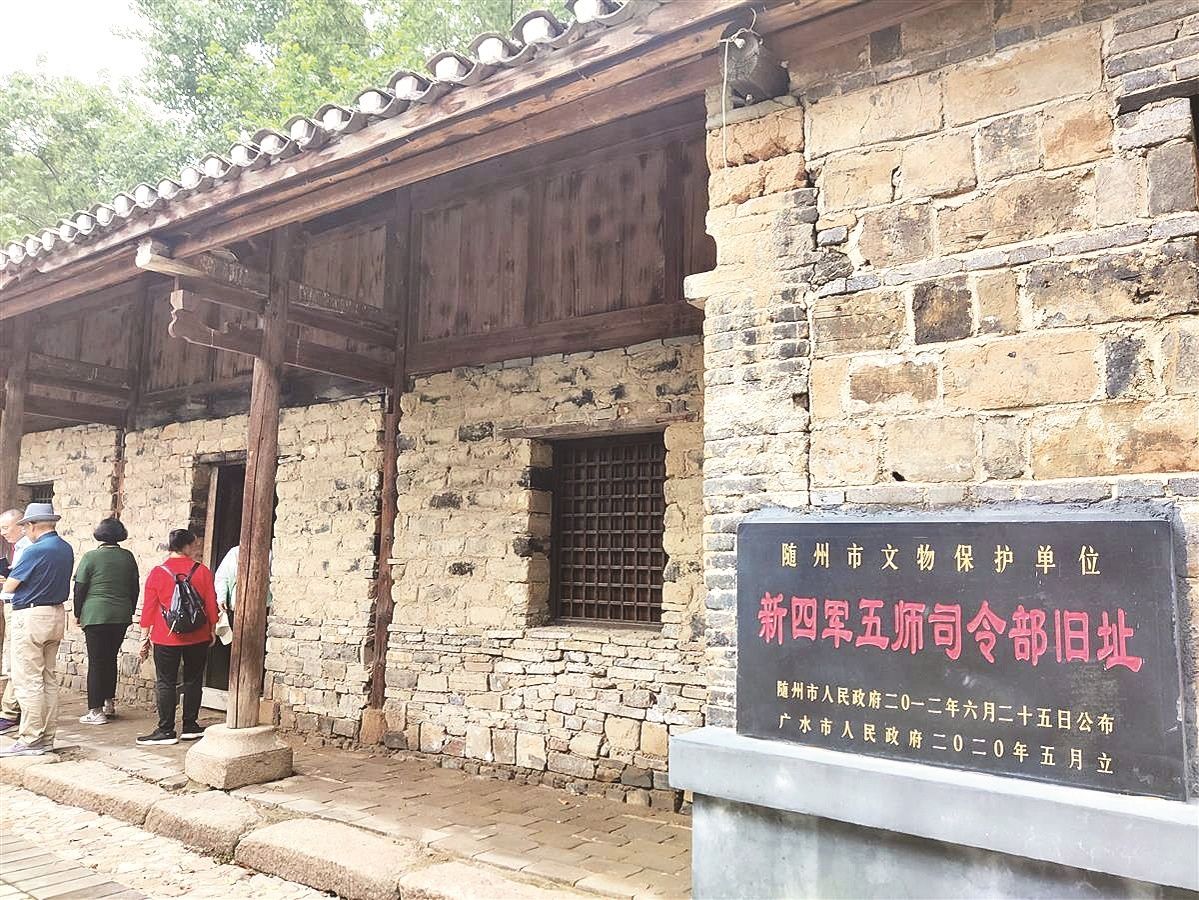 在位于尹家湾的新四军第五师革命旧址群,这里依然有村民生活,部分建起了新房,只有老房子无言地诉说了那段革命历史,散落分布在新房子中。夏日的尹家湾,沿途的银杏树叶子长得翠绿,路边的杂草里也是繁花似锦,恰逢傍晚,有房子的烟囱升起了袅袅炊烟,一片宁静美好。在新四军第五师司令部旧址,茅草与黄土糊成的外墙伤痕累累,里面是简朴的陈设和先辈们的雕像。