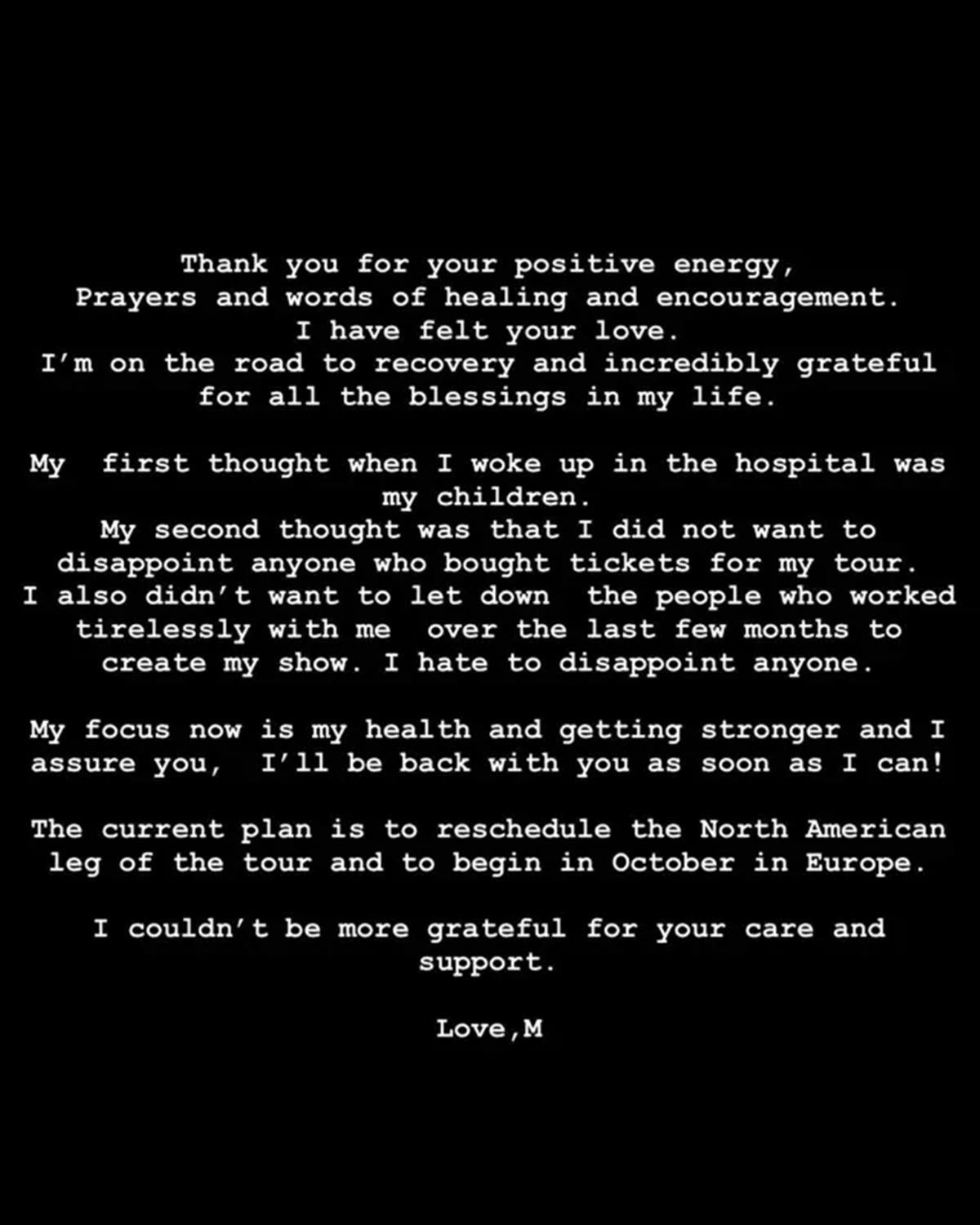 麦当娜在Instagram上发表了一份声明,感谢粉丝们的祈祷和鼓励,她表示,一周半前出院后,她目前正在专注康复以尽快重返舞台。