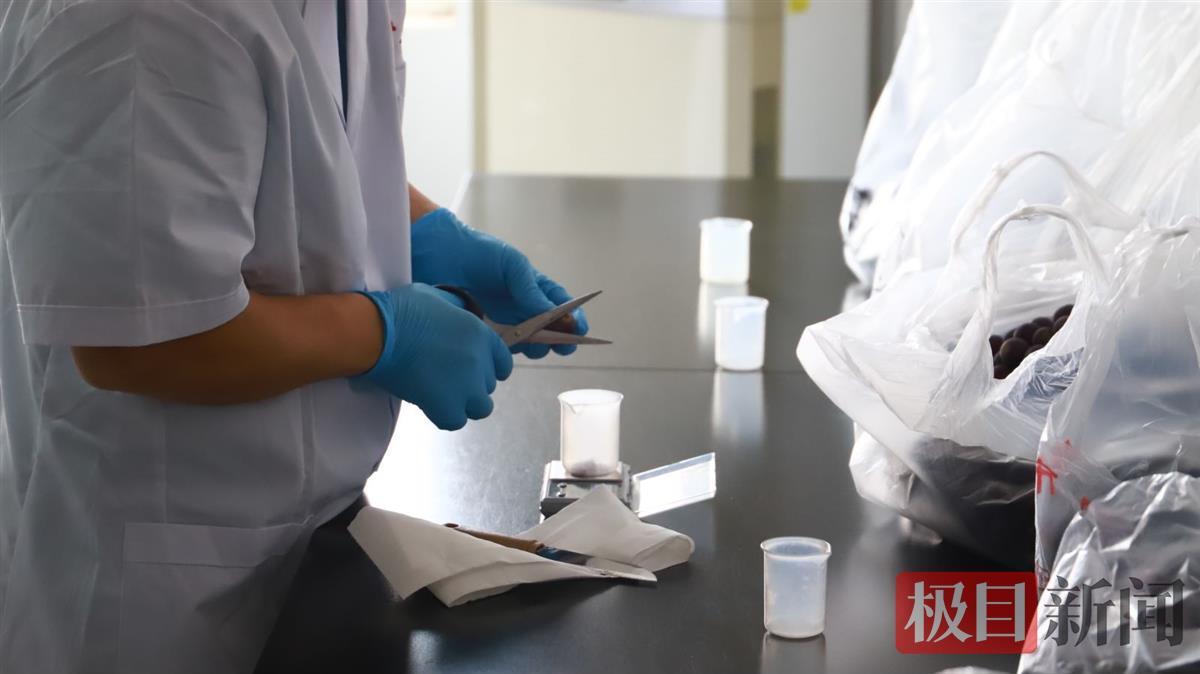 在青青种植专业合作社里,记者看到,检测工作人员在葡萄架上随机抽取了3个样品:“我们的同事在其他几座园林里,一共要抽取7个样品,一起带回去检测。”