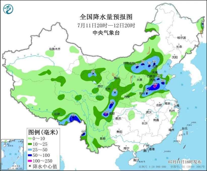 山西北部、河北中北部、北京、天津西部、内蒙古中部偏南地区、山东大部、河南中北部、江苏北部、四川盆地西部、甘肃东南部、青海北部、西藏东南部、云南西部等地部分地区有大到暴雨,其中,山东西部、四川盆地西部等地局部地区有大暴雨。