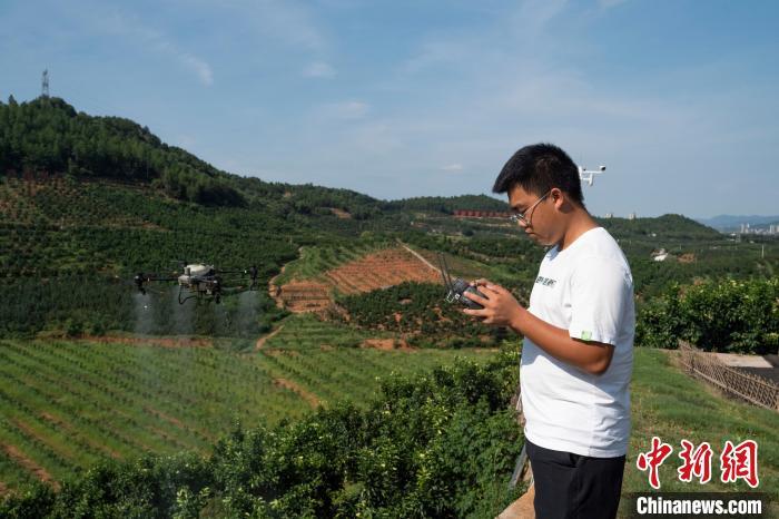 7月11日,姚献文在上饶市广丰区西坛果园操作无人机进行植保作业。 中新社记者 朱莹 摄